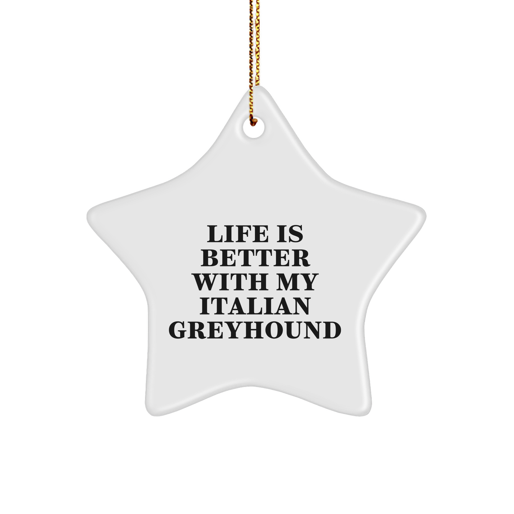 - Our Italian Greyhound Dog Star Ornament is designed to bring a smile to anyone's face with its funny quote 'Life Is Better With My Italian Greyhound' printed on it.