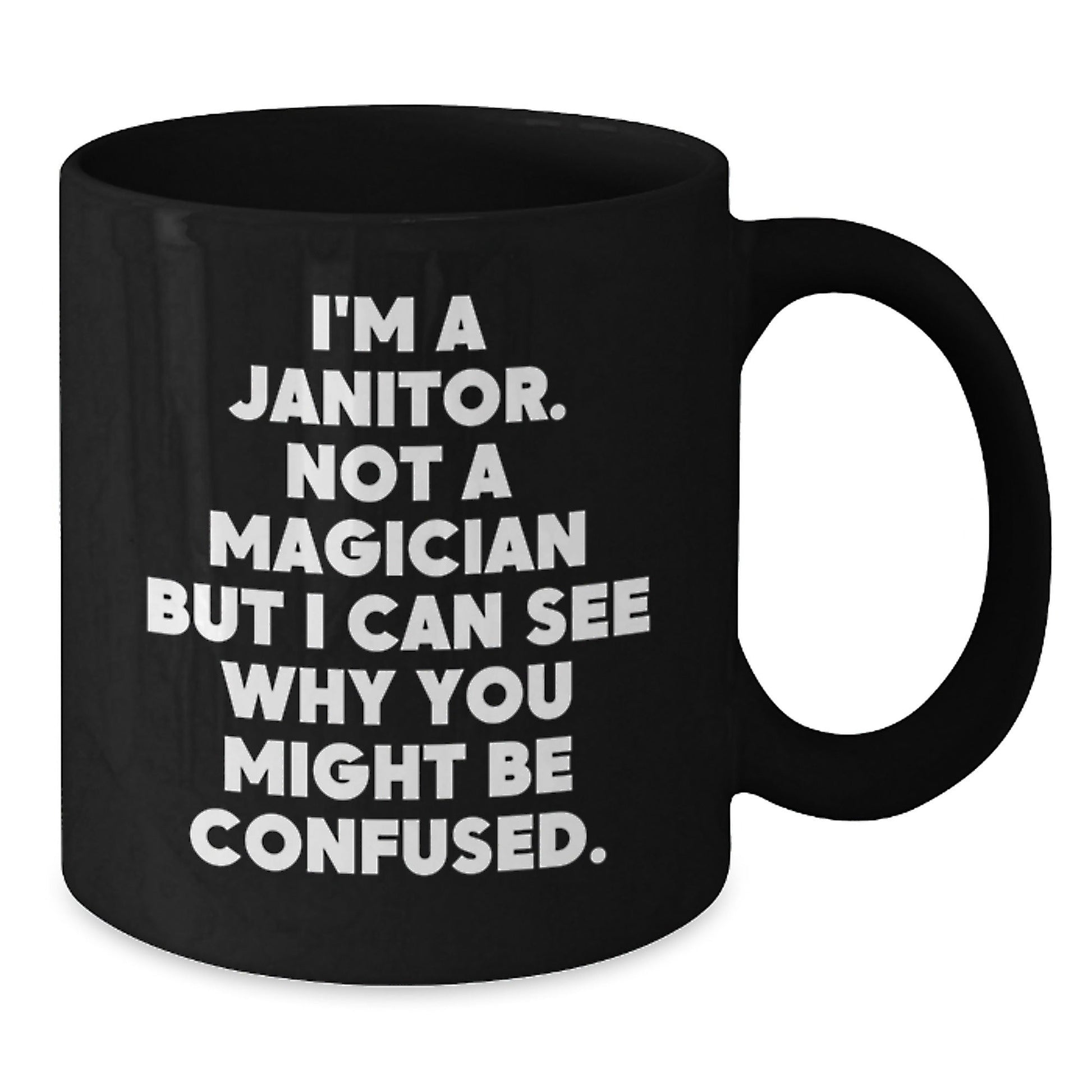 Are you a friend or coworker looking for a unique and humorous gift for a graduating janitor? Look no further! This black coffee mug is the perfect way to show your appreciation for their hard work and dedication. With its funny quote, 'I'm A Janitor. Not A Magician But I Can See Why You Might Be Confused.,' this mug is sure to bring a smile to their face.