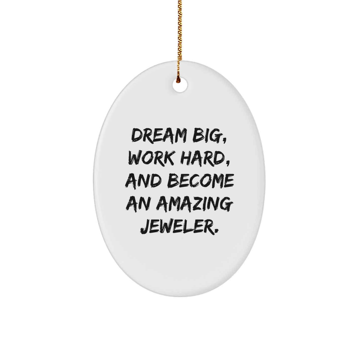 - This inspirational oval ornament is the perfect way to encourage the jeweler in your life to 'Dream Big, Work Hard, And Become An Amazing Jeweler.'