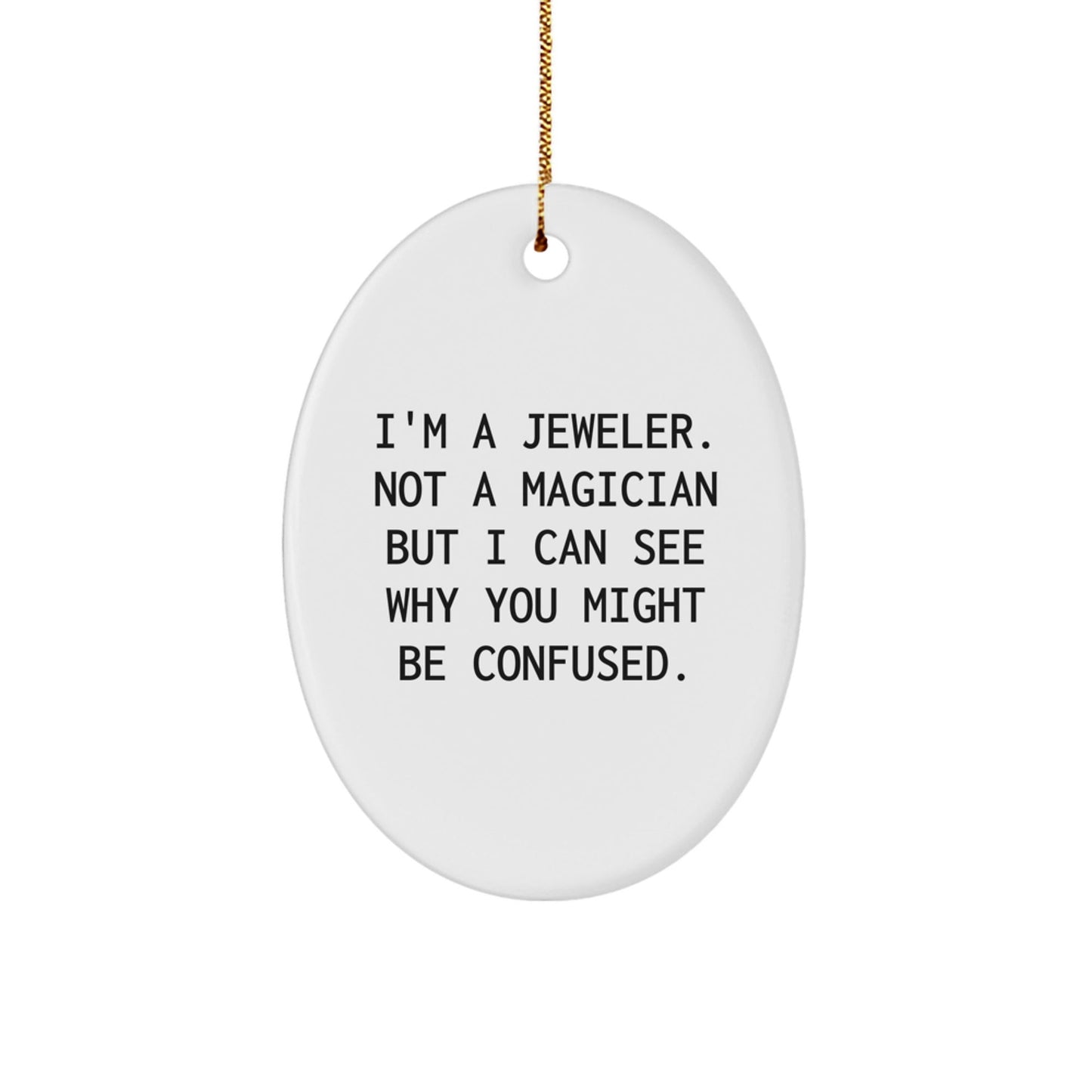 Are you a jeweler or know someone who is? This Oval Ornament is the ideal gift! Handcrafted with sturdy MDF and high-gloss plastic, it's lightweight and resistant to breaking. The vibrant colors will surely catch their eye. Perfect for stress-free decorating, it comes with a festive gold cord for easy hanging. The quote 'I'm A Jeweler. Not A Magician But I Can See Why You Might Be Confused.' adds a funny touch to this unique gift. Whether you're a jeweler or just a fan of funny gifts, this Oval Ornament is sure to bring a smile. Gift it to your friends, coworkers, or family members this Christmas and make their day. So why wait? Get your Oval Ornament today and spread some joy!