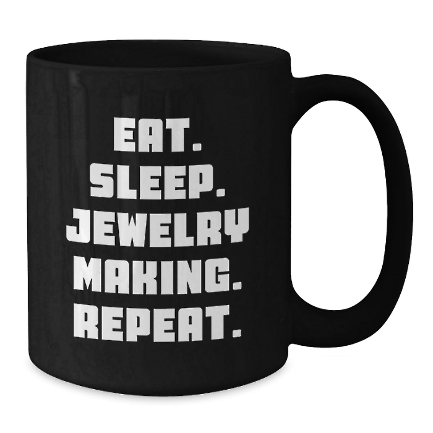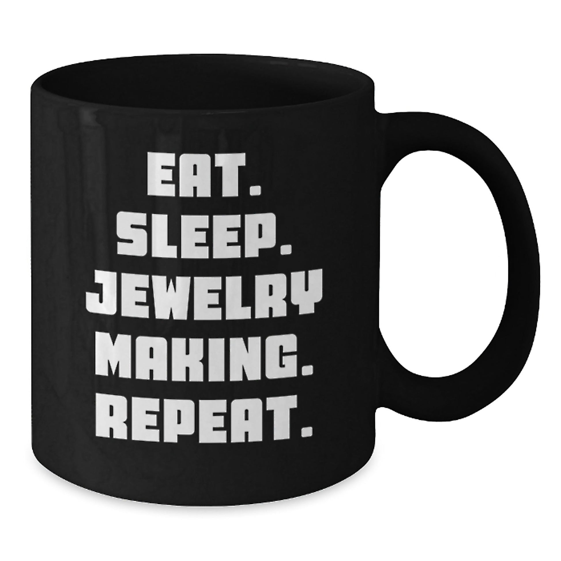 - Get ready to fuel your jewelry making passion with this black coffee mug, perfect for hot beverages and featuring the inspirational quote 'Eat. Sleep. Jewelry Making. Repeat.'