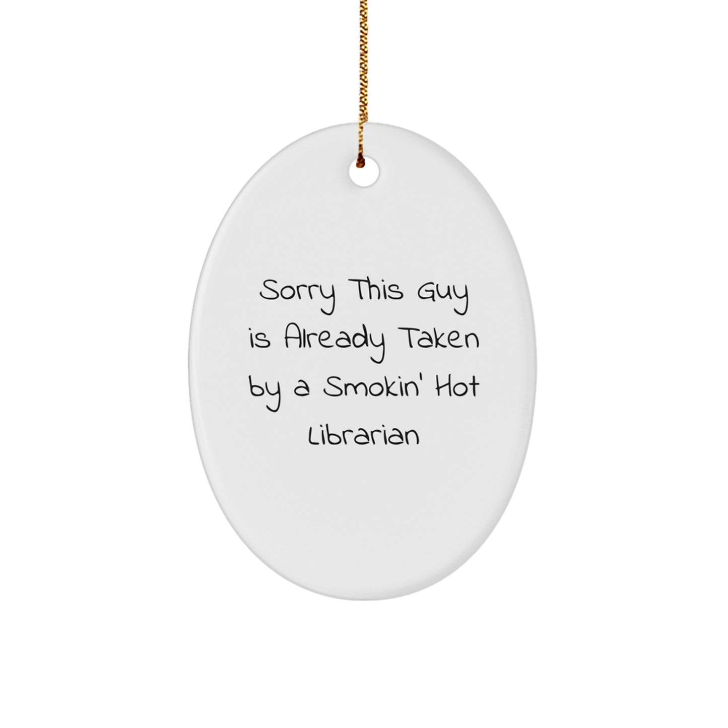 Are you looking for a unique gift for the librarian in your life? Look no further! This funny oval ornament is the perfect way to show your appreciation for their hard work. The quote 'Sorry This Guy Is Already Taken By A Smokin' Hot Librarian' is a humorous way to acknowledge their dedication to their craft.