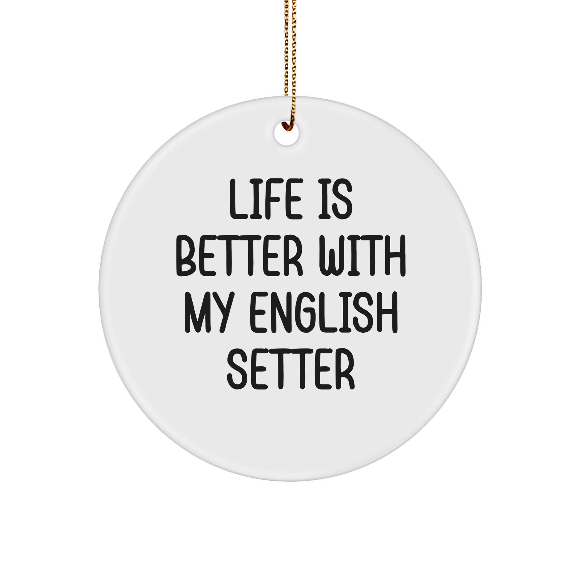 - Make this English Setter Dog circle ornament a treasured keepsake for years to come by giving it a special place in your home. Share the love and appreciation for English Setter Dogs with friends and family, and create a lasting memory with this beautiful circle ornament. From the sender, with love, to the recipient, a heartfelt gift idea. (274 chars)