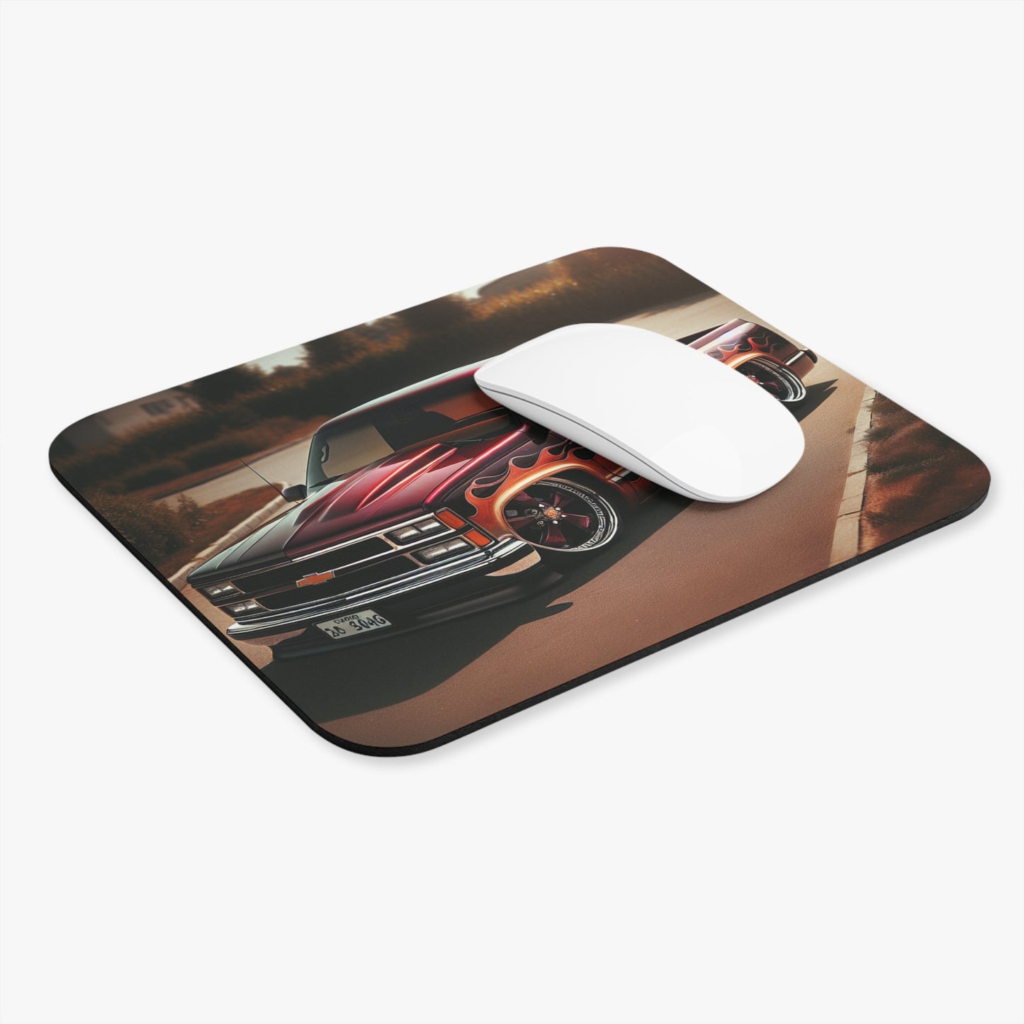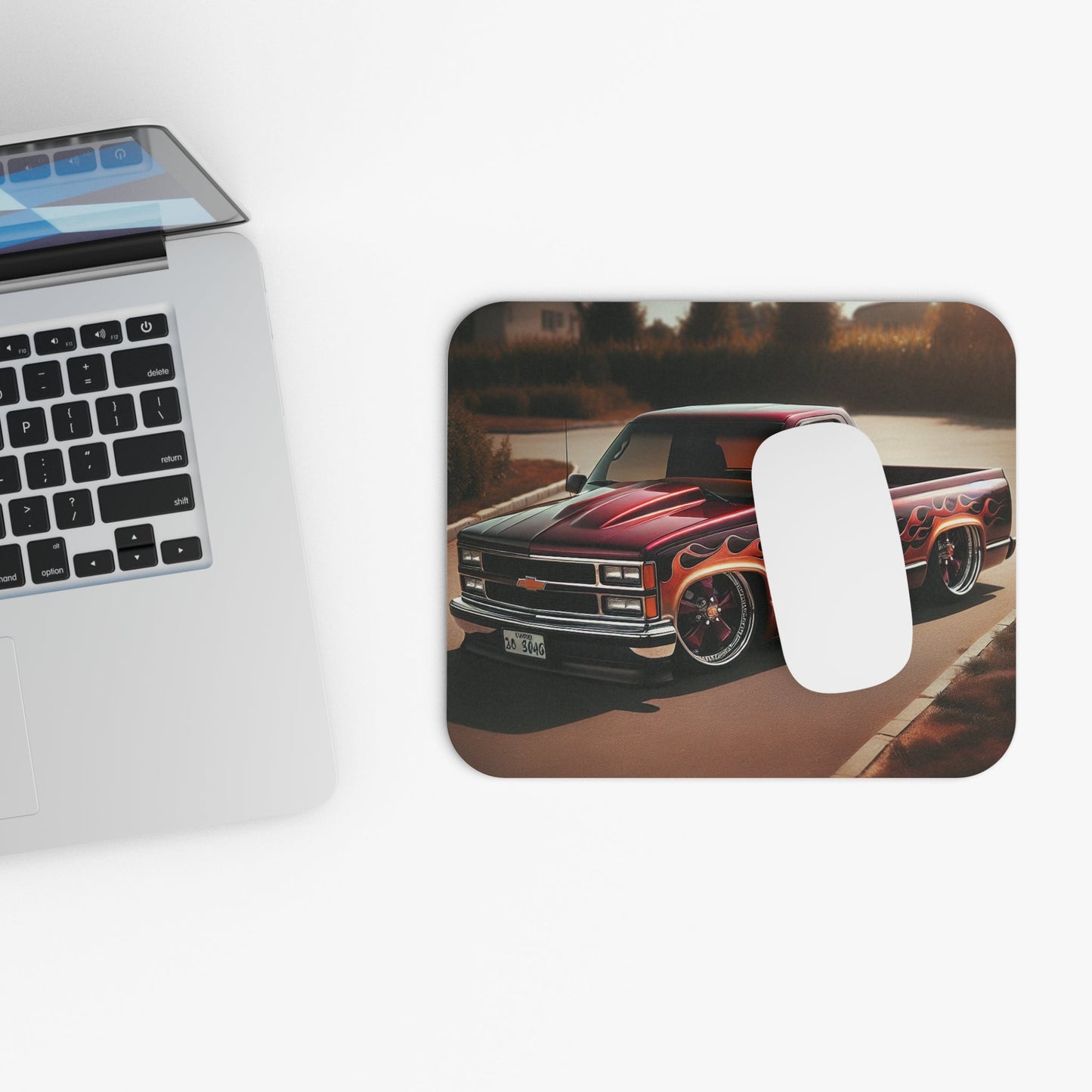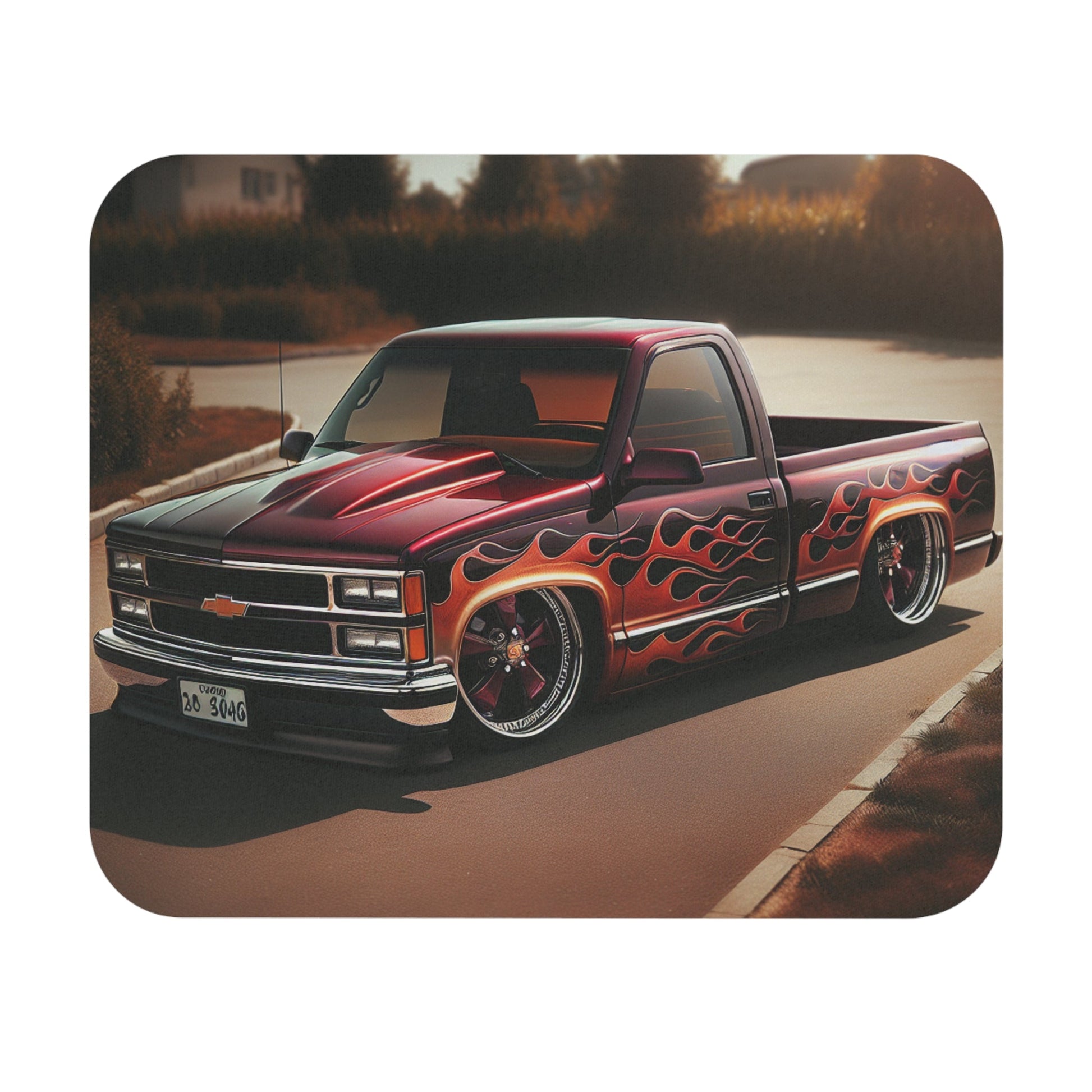 This Lowered Chevy Truck with Flames designed Mouse Pad brings a cool and edgy vibe to your workstation. Perfect for car enthusiasts and fans of unique designs. Ideal for adding a pop of color and personality to your desk. Great for birthdays, Father's Day, and automotive themed events.