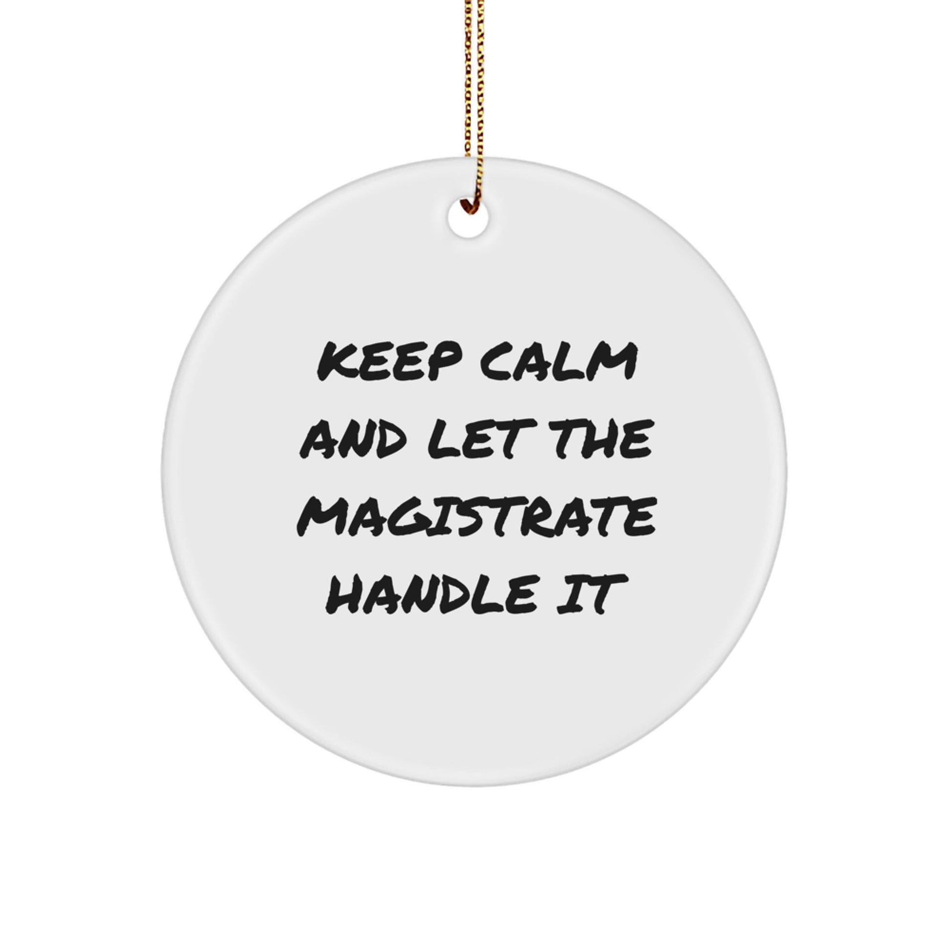 - This Circle Ornament is a fun and unique way to show your love and appreciation for the Magistrate in your life. With its funny quote 'Keep Calm And Let The Magistrate Handle It', it's sure to bring a smile to their face.