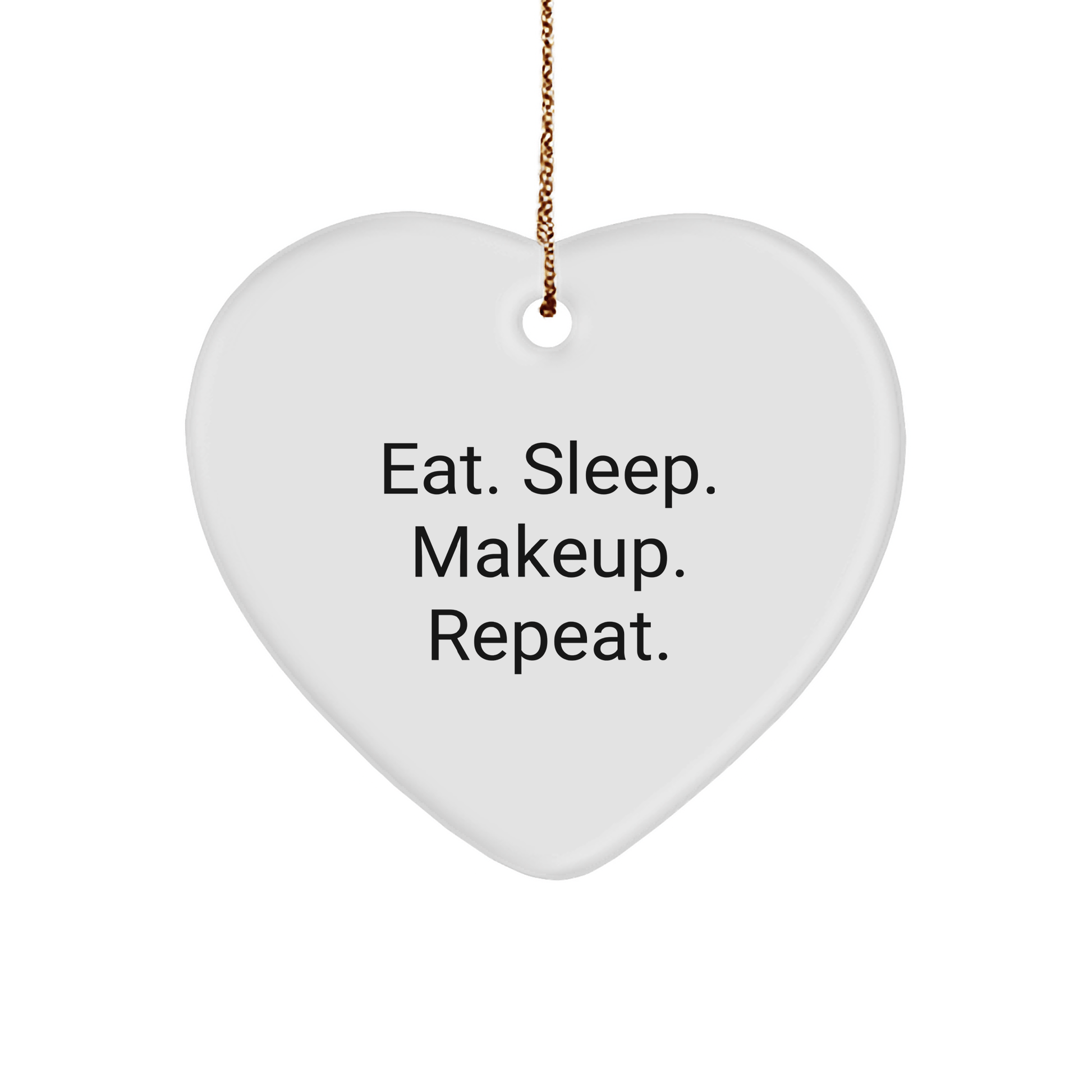 - This heart ornament is a thoughtful gift for anyone who loves makeup, making it a great choice for friends, family, or coworkers. The quote 'Eat. Sleep. Makeup. Repeat.' is a fun and relatable phrase that makeup enthusiasts will adore.