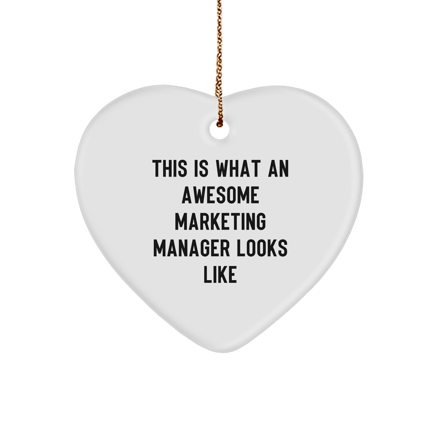 Are you looking for a unique and funny gift for your marketing manager friend or colleague? Look no further! This heart-shaped ornament is the perfect way to show your appreciation for their hard work and dedication. The quote 'This Is What An Awesome Marketing Manager Looks Like' is a humorous and relatable way to acknowledge their skills and accomplishments.