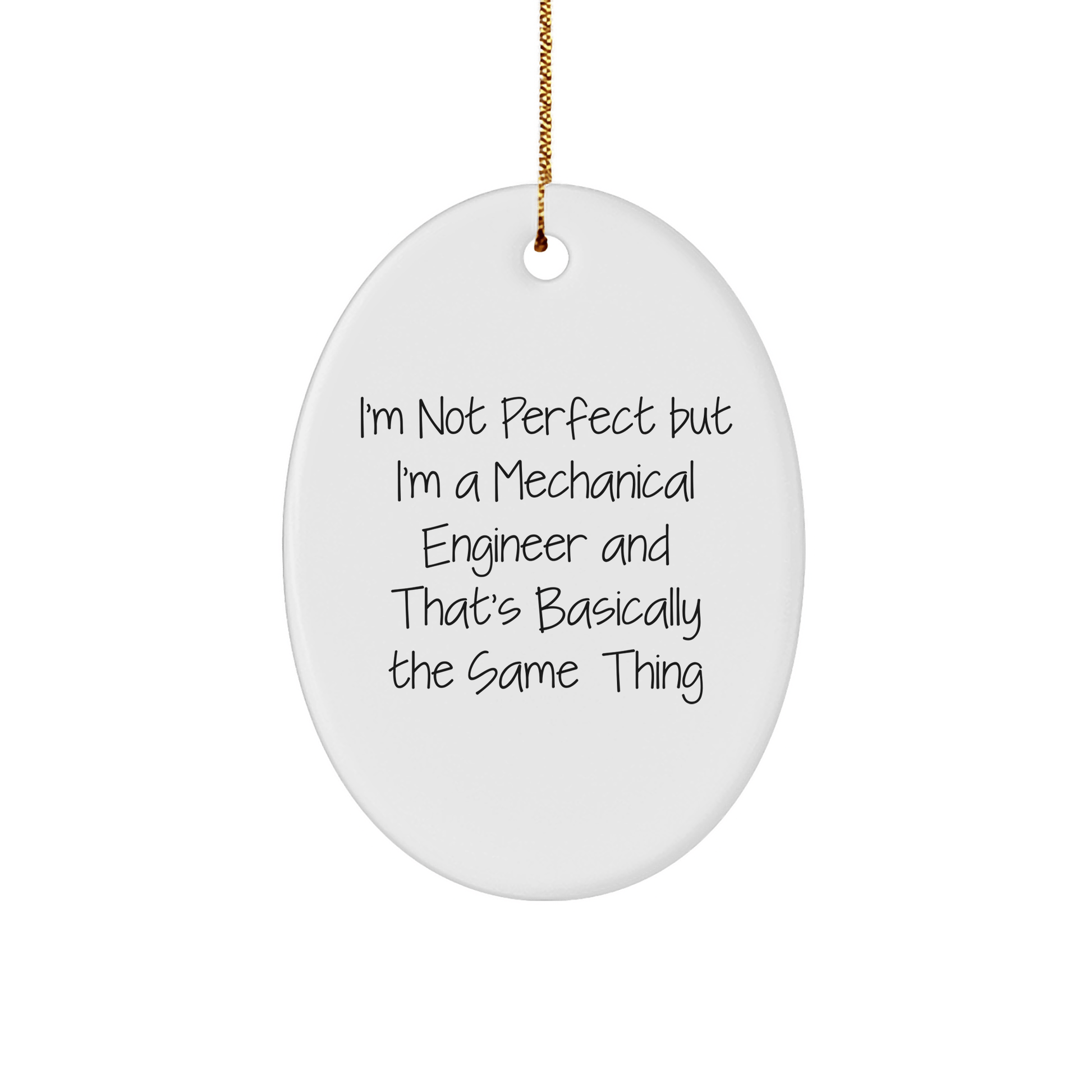 This ornament is a fun and lighthearted way to celebrate the holiday season. The quote 'I'm not perfect, but I'm a Mechanical Engineer, and that's basically the same thing' is a humorous take on the challenges of being a Mechanical Engineer. It's a great way to poke fun at the profession and show your loved one that you appreciate their efforts.