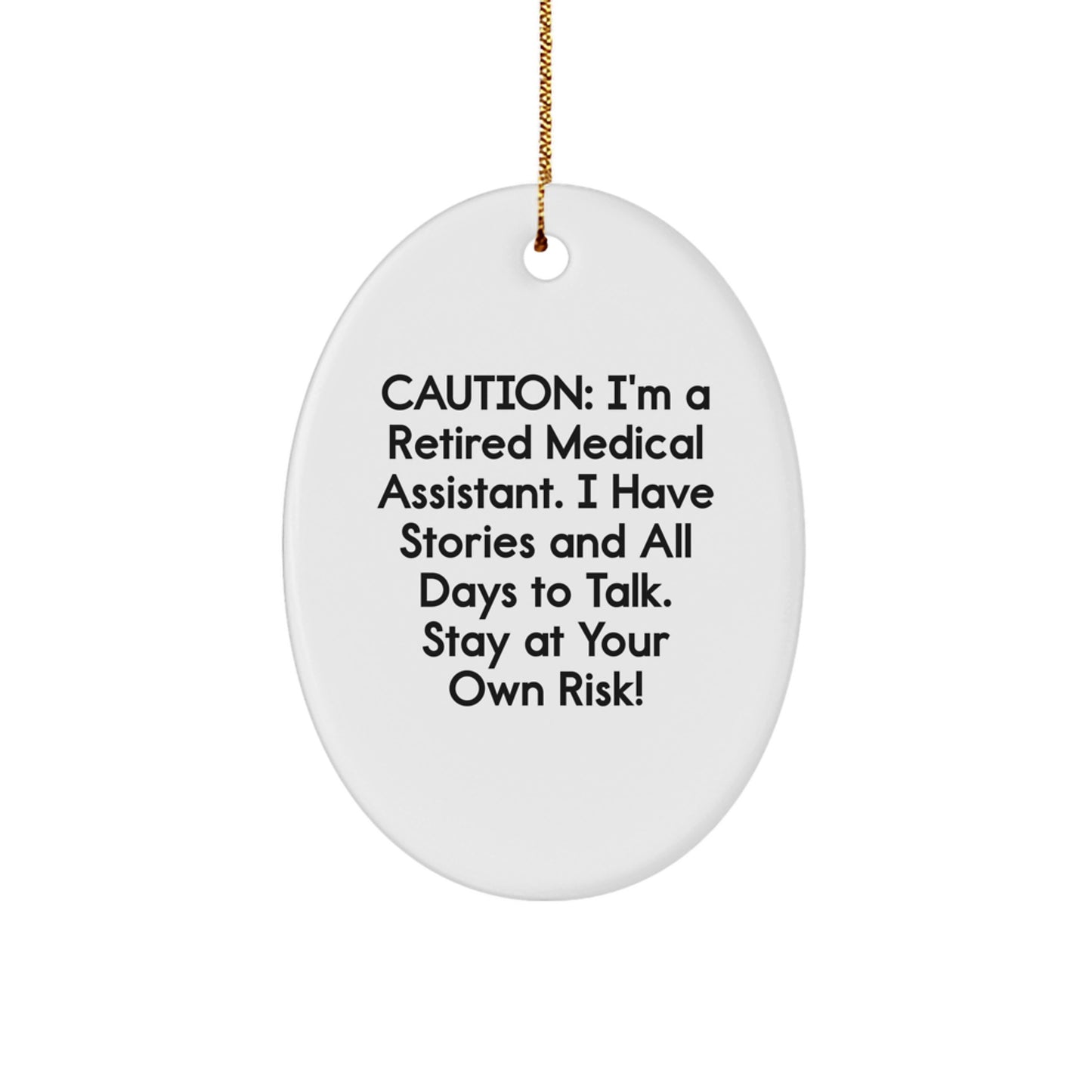 Are you looking for a unique and thoughtful gift for the Medical Assistant in your life? Look no further! This 'Caution: I'm A Retired Medical Assistant... Stay At Your Own Risk!' Oval Ornament is the perfect present for the holiday season. As a retired Medical Assistant, I have stories and all days to talk, but I'll stay at your own risk!