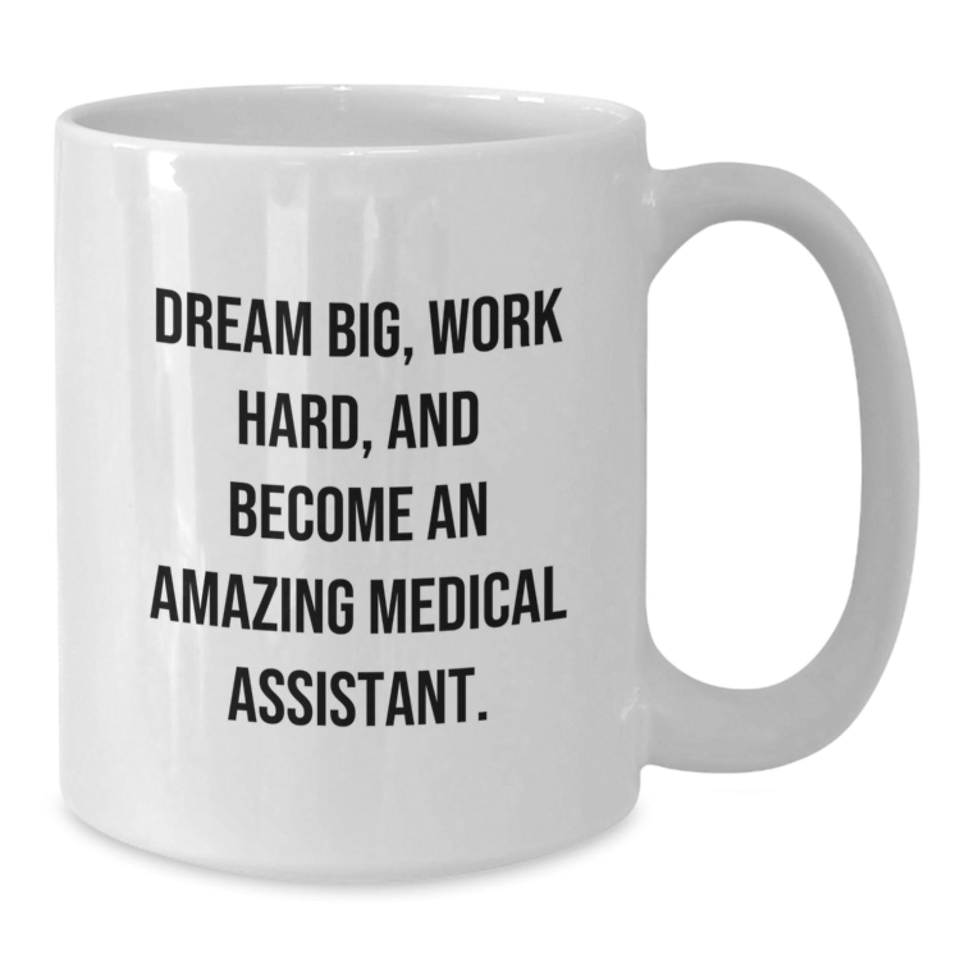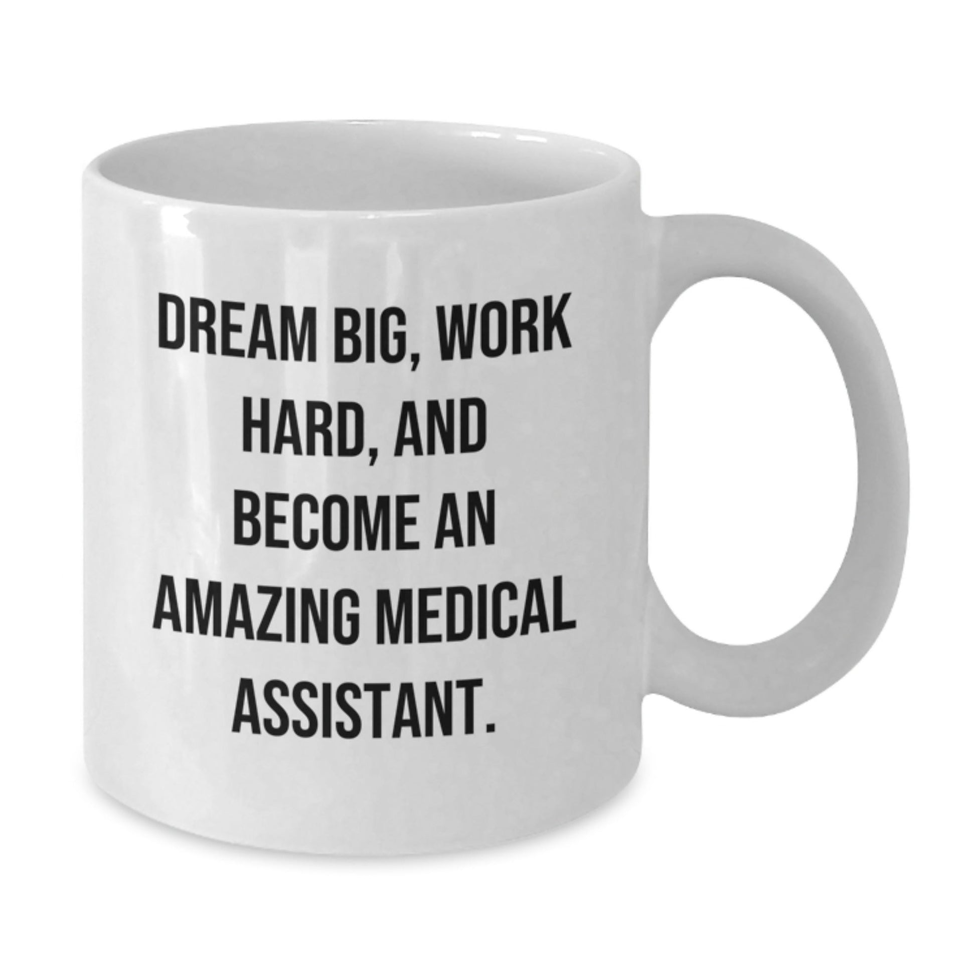 - High-quality ceramic coffee mug with inspirational quote 'Dream Big, Work Hard, And Become An Amazing Medical Assistant.' to motivate medical assistants to reach their full potential