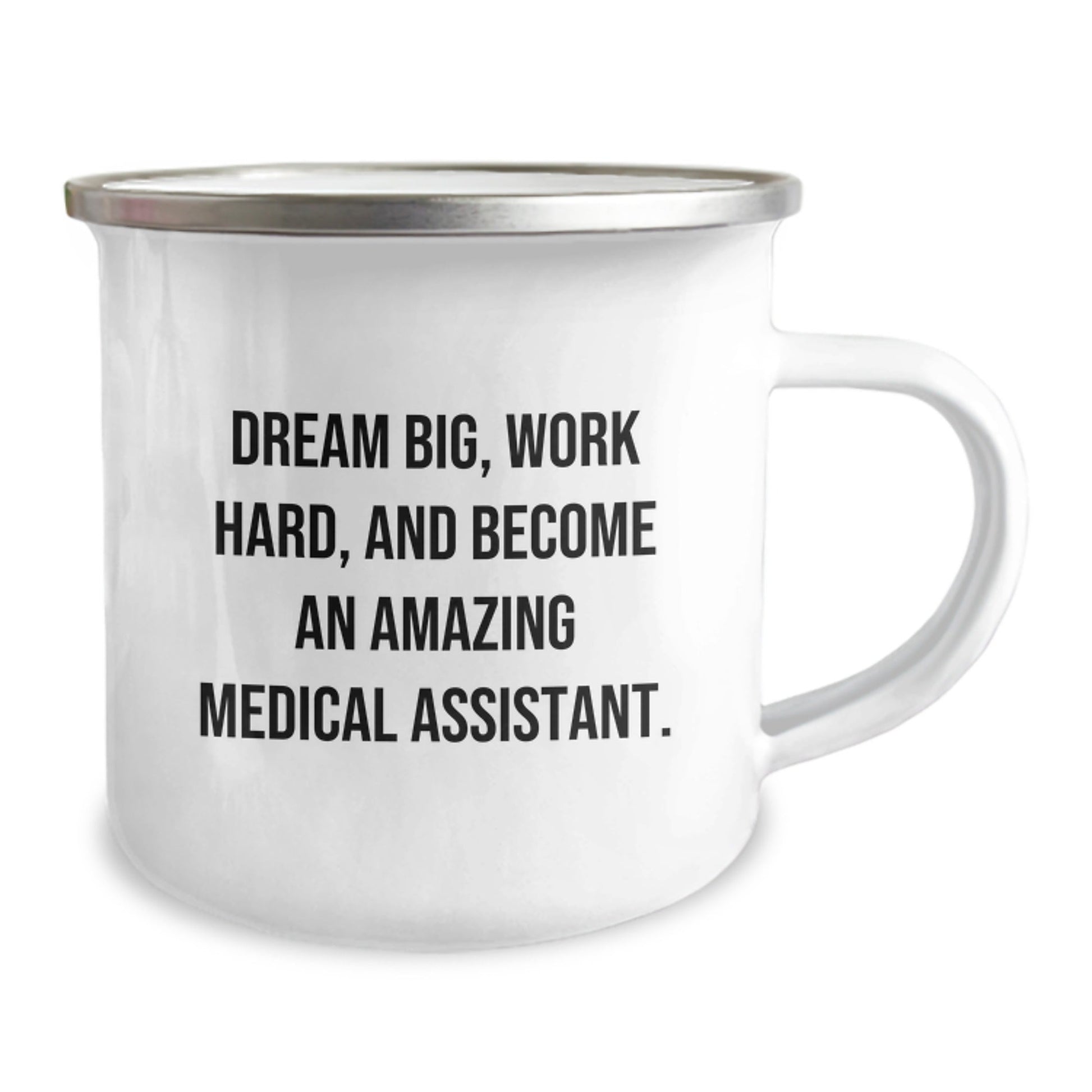 Are you a Medical Assistant or know someone who is? Celebrate their hard work and dedication with this unique and thoughtful gift! The quote 'Dream Big, Work Hard, And Become An Amazing Medical Assistant.' is a perfect reminder of their journey and the amazing things they can achieve. This 12 oz stainless steel camping mug with enamel finish is the perfect way to do so. Its permanent printing ensures the quote won't fade after washing, making it a lasting reminder of their medical assistant journey.