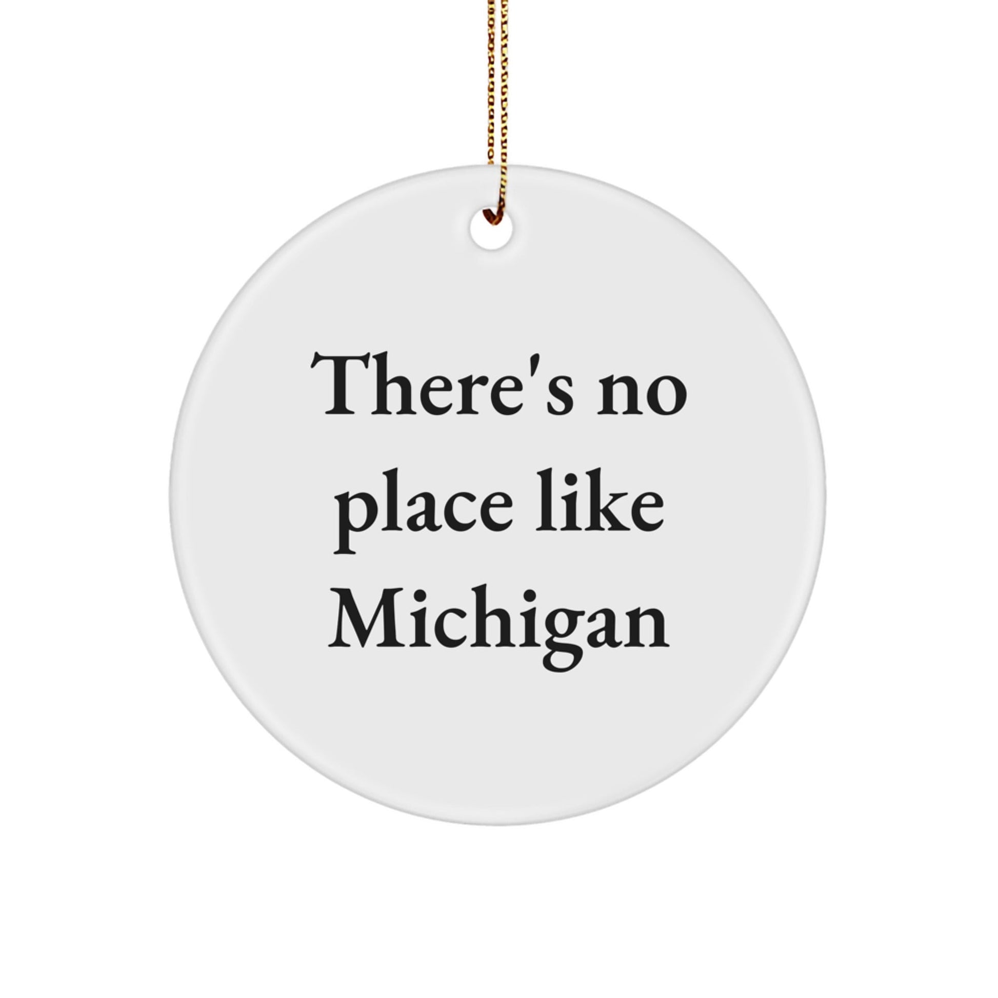 - Unique Michigan Circle Ornament with vibrant print and sturdy MDF construction, perfect for decorating your home or giving as a gift; Makes a thoughtful present for friends and family who love Michigan; 'There's No Place Like Michigan' quote adds a touch of humor and whimsy to your holiday decor; Lightweight and resistant to breaking, making it a great choice for households with children or pets; Ships with a festive gold cord for easy hanging and stress-free decorating