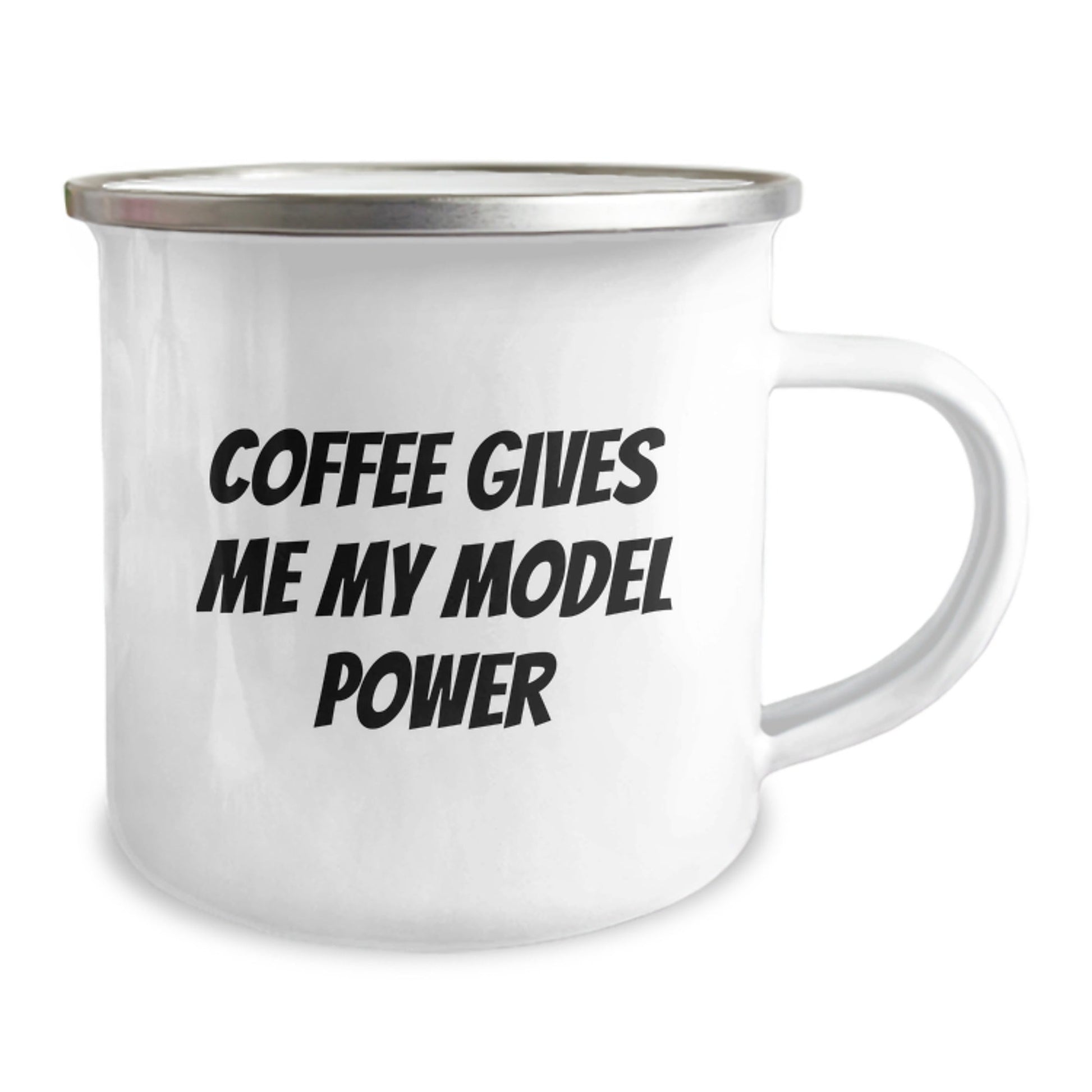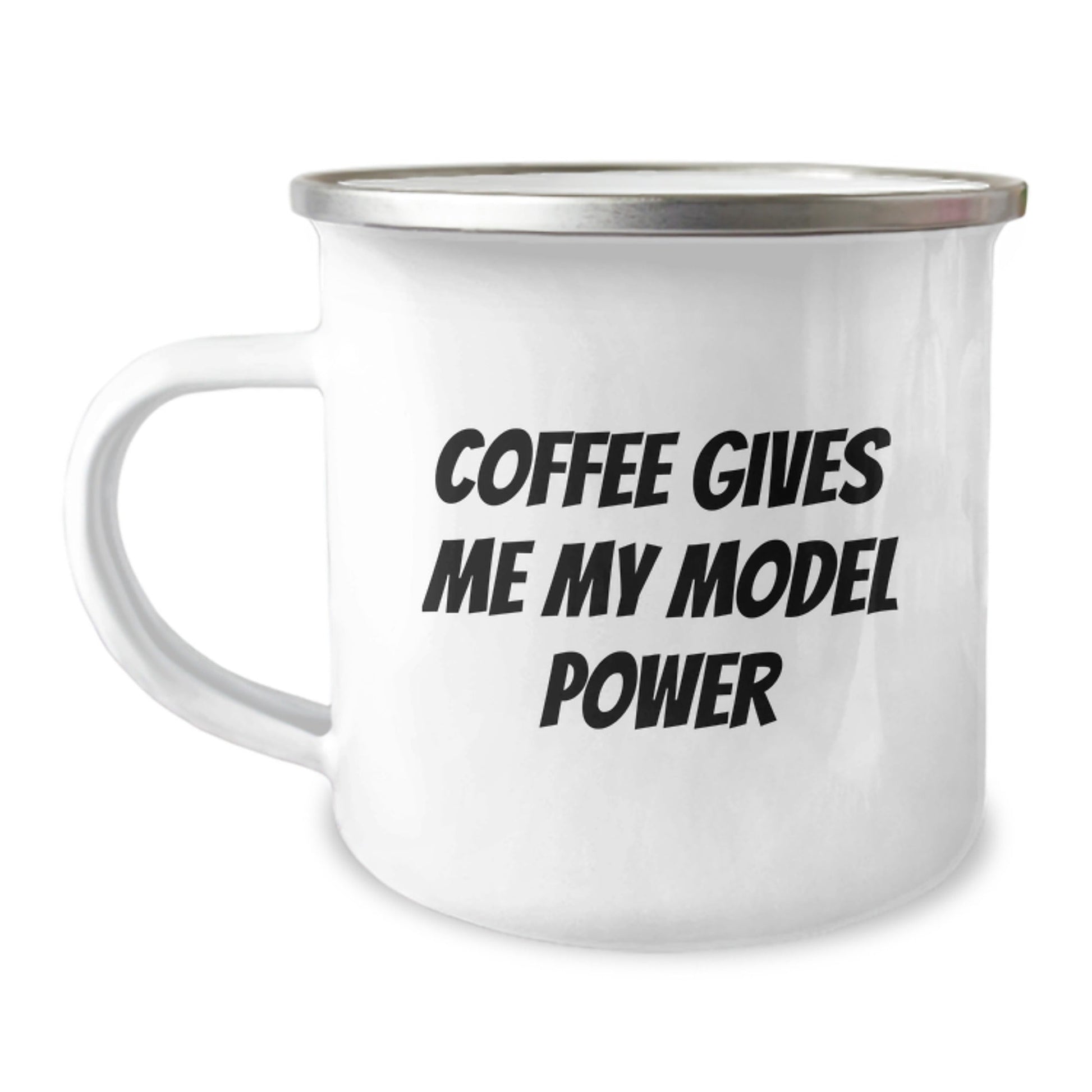 Are you a model enthusiast looking for a unique gift for your birthday? Look no further! This funny coffee cup features the quote 'Coffee Gives Me My Model Power' in a bright, bold font. The perfect way to start your day off right, this camping mug is made of stainless steel with an enamel finish, ensuring it will withstand even the toughest of model sessions.