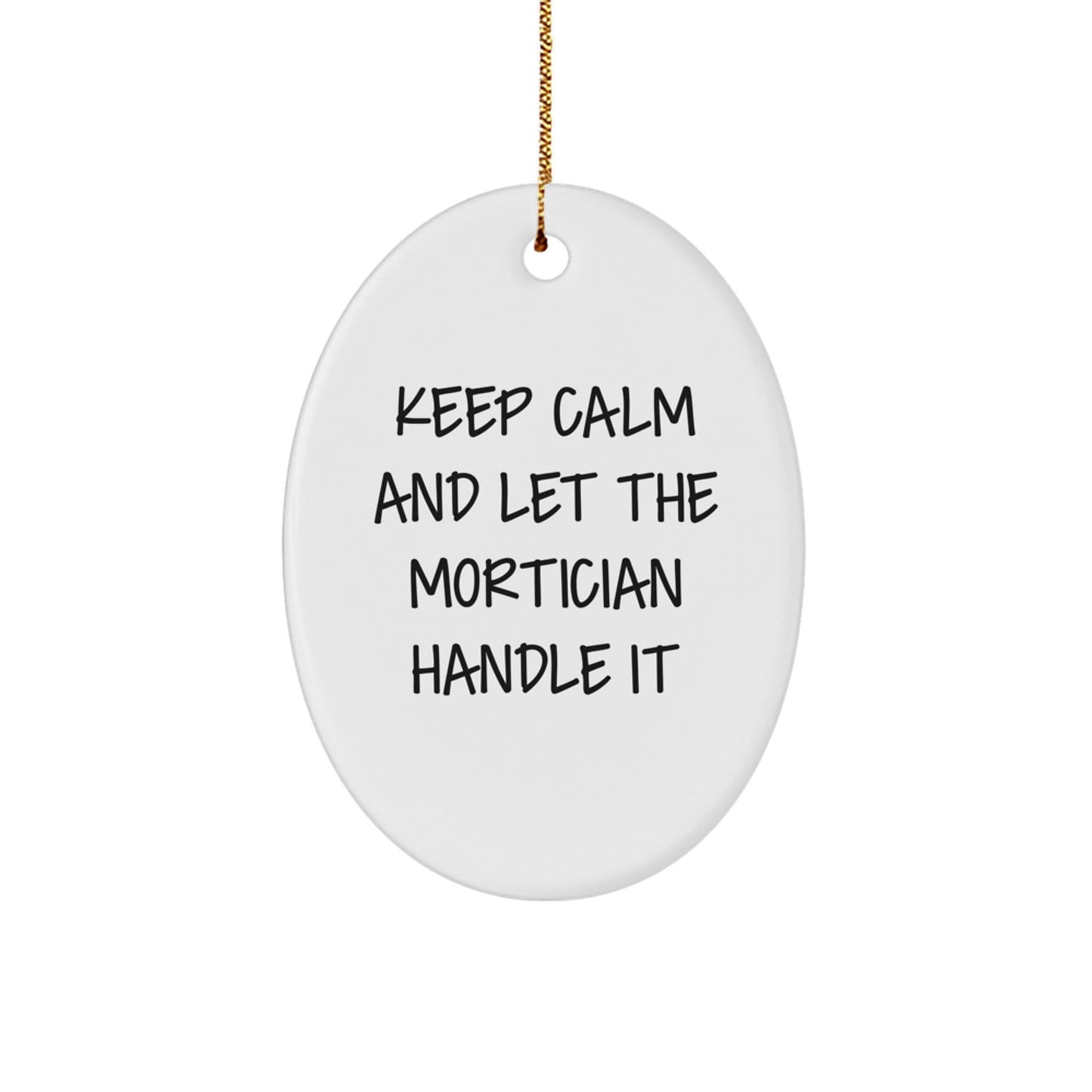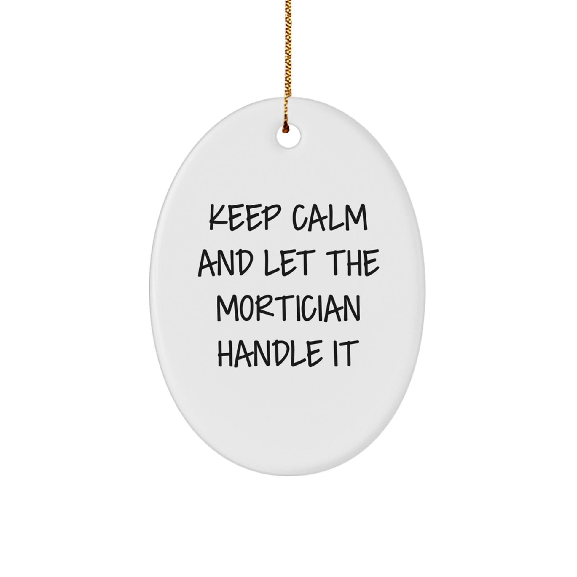 With its vibrant design and fun quote, this ornament is sure to bring a touch of humor and personality to any room. It's the perfect way to show your mortician that you care about their work and appreciate the important role they play in helping families say goodbye to their loved ones. So don't wait - get your 'Keep Calm And Let The Mortician Handle It' Oval Ornament today and make someone's holiday season a little brighter!