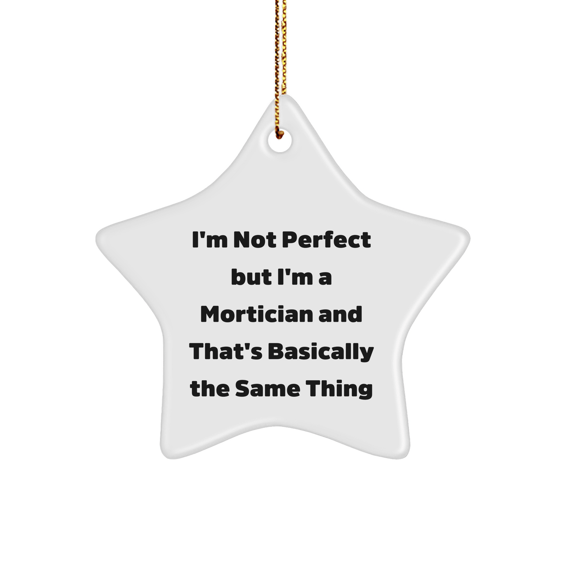 Are you looking for a unique gift for the mortician in your life? Look no further! This star ornament is a funny and thoughtful way to show your appreciation for their hard work. Inspired by the quote 'I'm not perfect but I'm a mortician and that's basically the same thing', this ornament is sure to bring a smile to their face. Made from sturdy MDF and high-gloss plastic, this ornament is lightweight and resistant to breaking, making it a great choice for households with children or pets. The festive gold cord makes it easy to hang, and the vibrant colors will add a pop of color to any room.