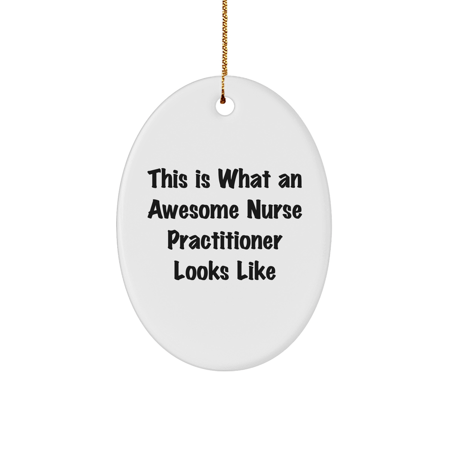 - This Is What An Awesome Nurse Practitioner Looks Like Oval Ornament is a unique and thoughtful gift for nurse practitioners, perfect for their office or home. The quote's funny tone makes it a great conversation starter, and the vibrant colors and festive gold cord ensure a stress-free decorating experience.