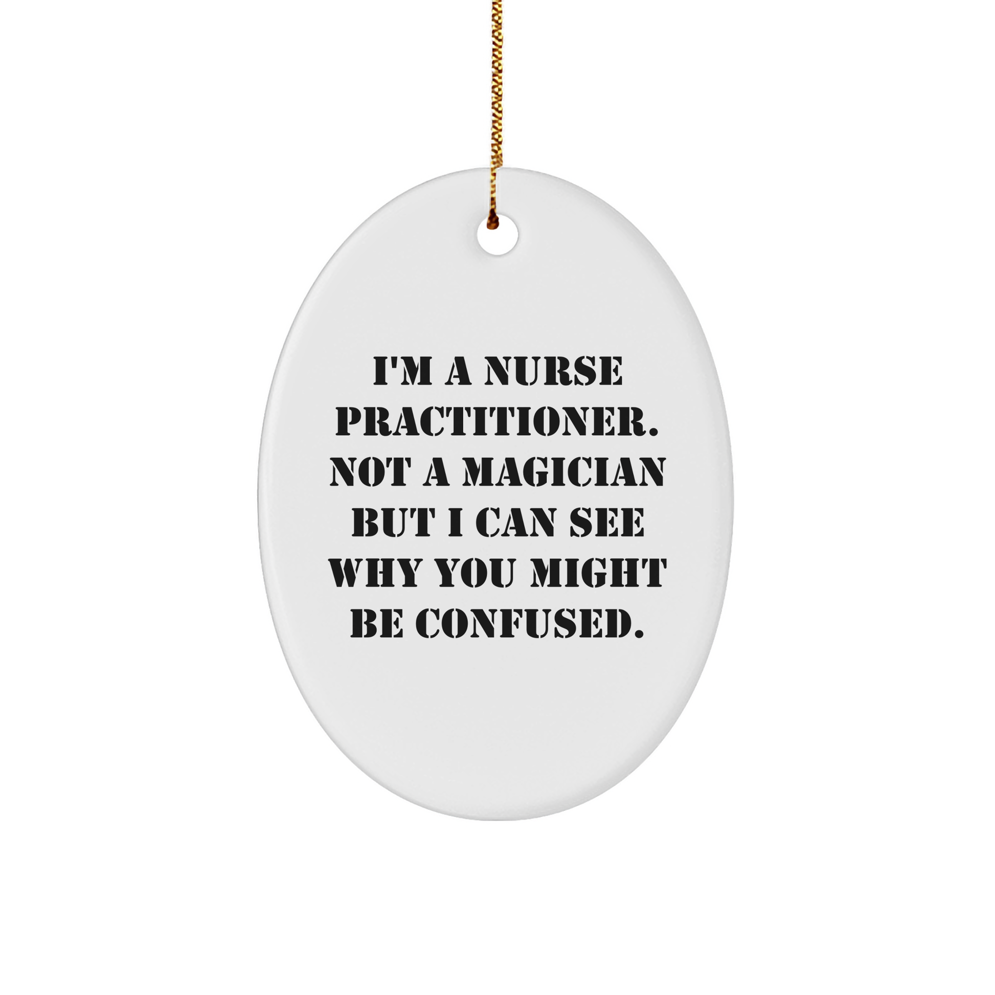 If you're looking for a unique gift for the nurse practitioner in your life, look no further! This oval ornament is the perfect way to show your appreciation for their hard work and dedication. The funny quote 'I'm A Nurse Practitioner. Not A Magician But I Can See Why You Might Be Confused.' adds a touch of humor to this thoughtful gift. Made from sturdy MDF with a high-gloss plastic finish, this ornament is lightweight and resistant to breaking, making it a great choice for households with children or pets. It's the perfect way to celebrate a special occasion or simply to show your nurse practitioner that you care. So why wait? Gift this unique ornament to your favorite nurse practitioner today!
