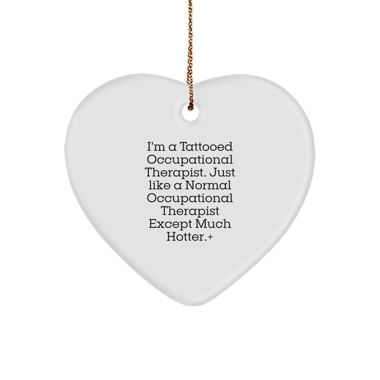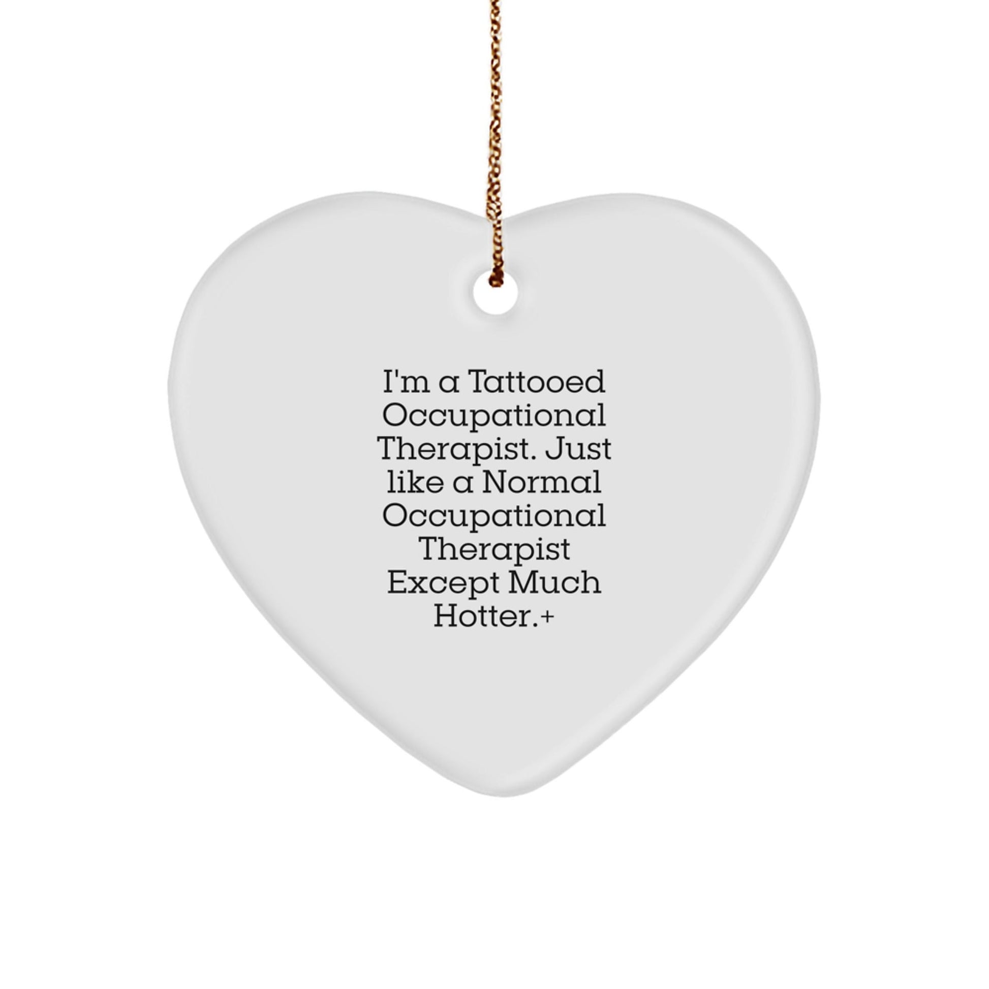 Get ready to delight an Occupational Therapist in your life with this unique and humorous heart ornament! 'I'm A Tattooed Occupational Therapist... Just Like A Normal Occupational Therapist Except Much Hotter!' says it all - a ideal gift for any Occupational Therapist enthusiast. This vibrant heart-shaped ornament is crafted from sturdy MDF with a high-gloss plastic finish and features a funny quote that's sure to bring a smile to their face. Whether you're a friend, family member, or coworker, this gift is a thoughtful way to show your appreciation for their hard work and dedication. So why not spread some cheer this Christmas and give the gift of laughter and inspiration?
