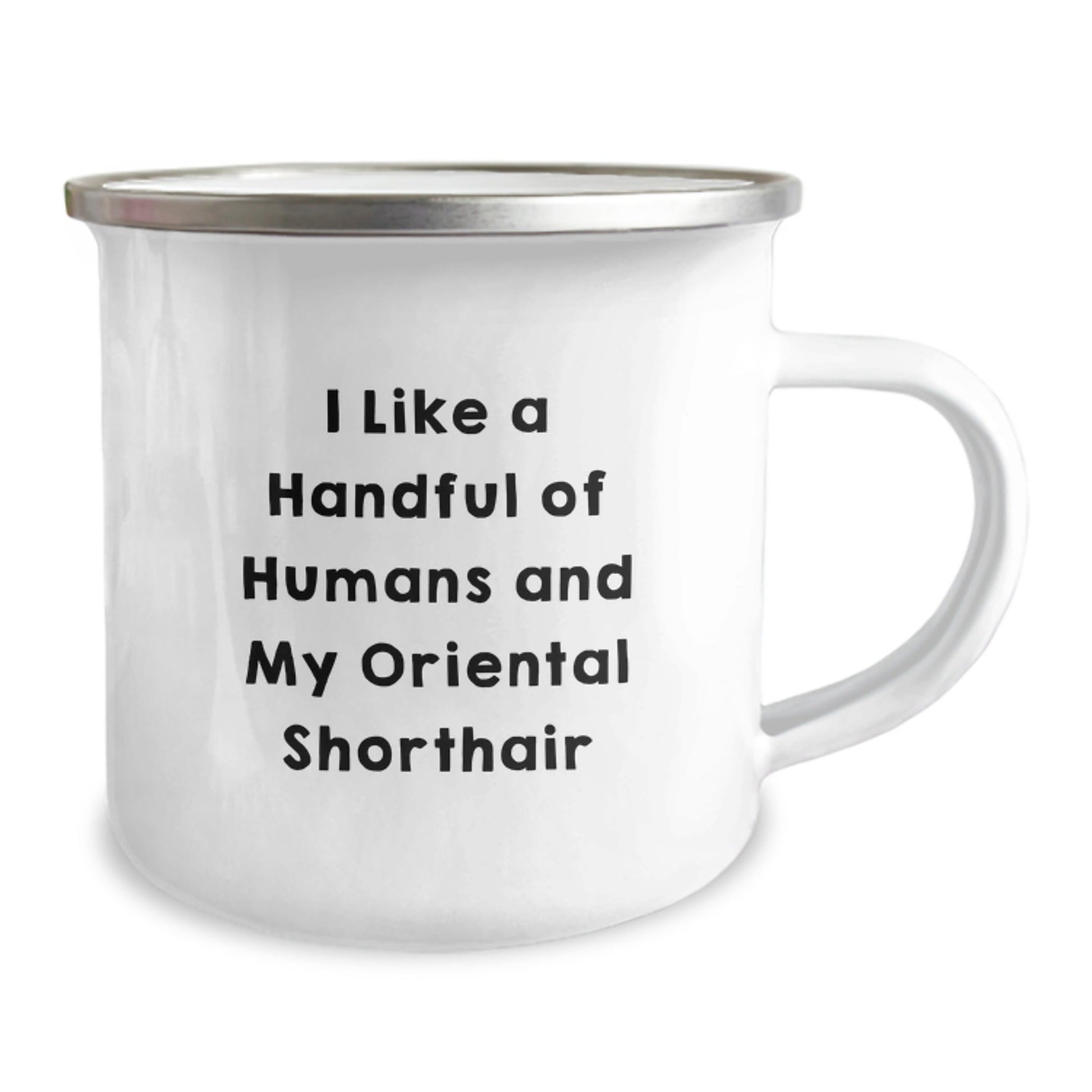 Bring a smile to the face of any Oriental Shorthair Cat enthusiast with this unique and funny gift! The quote 'I Like A Handful Of Humans And My Oriental Shorthair' is a great way to express their love for their feline companion. This 12 oz camping mug is made of stainless steel with an enamel finish, making it sturdy and easy to clean. The permanent printing won't fade after washing, ensuring the design remains vibrant and clear. Whether it's a graduation gift, a birthday present, or just a thoughtful surprise, this mug is sure to delight. So why not get your friends and family members a gift that shows you care? Don't miss out and make their day!