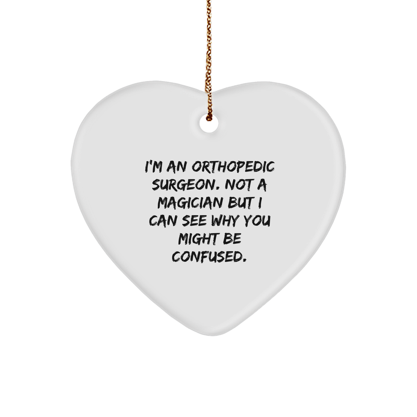 Are you looking for a unique gift for the Orthopedic Surgeon in your life? Look no further! This Heart Ornament is the perfect way to show your appreciation for their hard work and dedication. With its funny quote, 'I'm An Orthopedic Surgeon. Not A Magician But I Can See Why You Might Be Confused.', this gift is sure to bring a smile to their face. This Heart Ornament is crafted from sturdy MDF with a high-gloss plastic finish, ensuring it will last for many Christmases to come. The vibrant colors are printed from edge-to-edge via Sublimation, making it a beautiful addition to any room. And with its lightweight design and resistant to breaking, it's perfect for households with children or pets. Plus, it ships with a festive gold cord for easy hanging, making it stress-free decorating. Give the gift of laughter and appreciation this Christmas, and show the Orthopedic Surgeon in your life that you care.