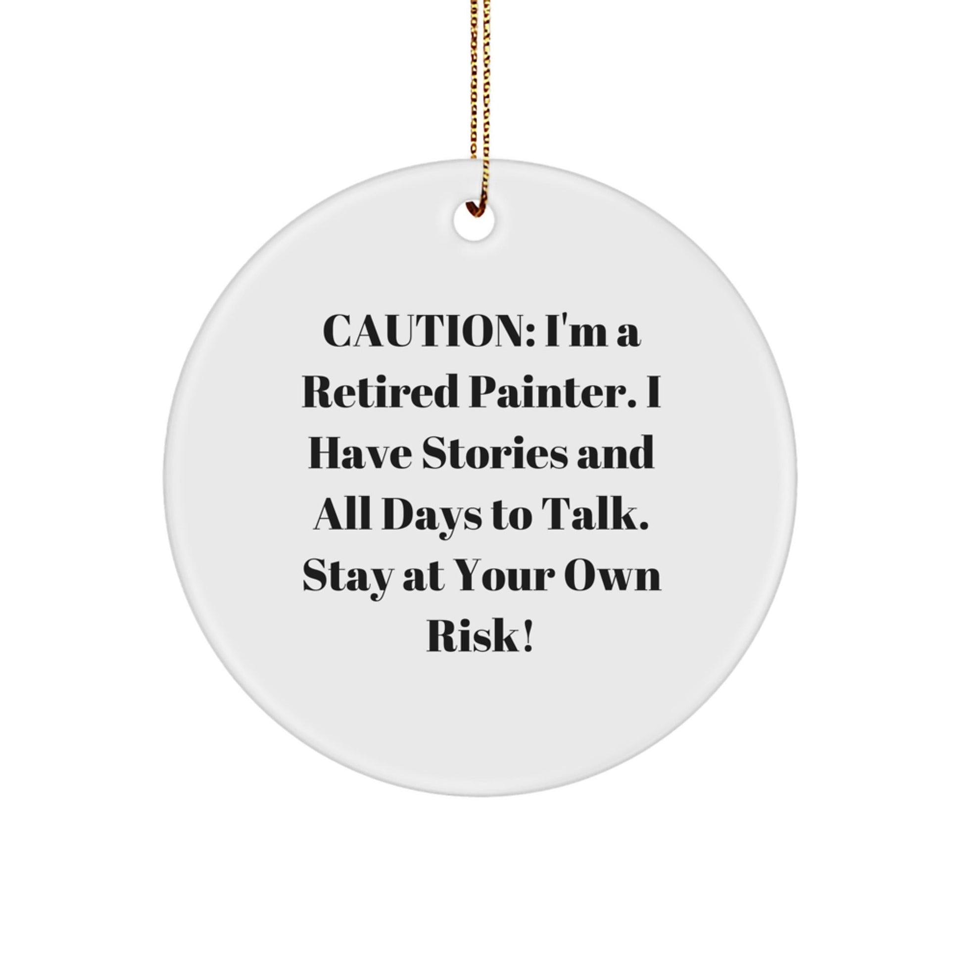 Are you looking for a unique and funny gift for the painter in your life? Look no further! This Christmas, give the gift of laughter with this delightful Circle Ornament featuring the quote 'Caution: I'm A Retired Painter. I Have Stories And All Days To Talk. Stay At Your Own Risk!'