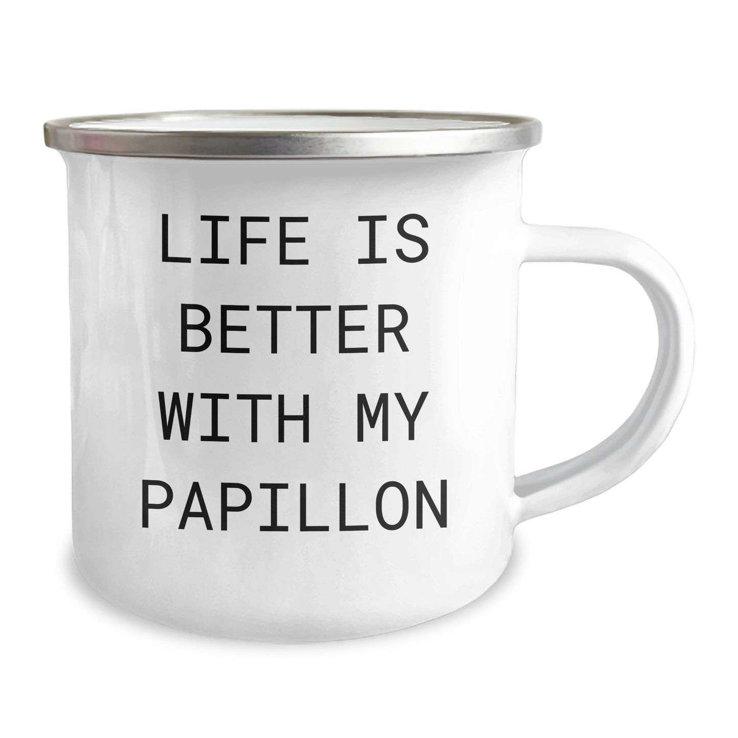 - Bring a smile to your Papillon-loving dad's face with this unique 'Life Is Better With My Papillon' camping mug, perfect for outdoor enthusiasts and dog lovers alike. Made from high-quality stainless steel with an enamel finish, this 12 oz capacity mug is sturdy and easy to clean. The permanent printing ensures your design won't fade after washing, making it a great gift for any dad who loves the great outdoors and his furry companion.