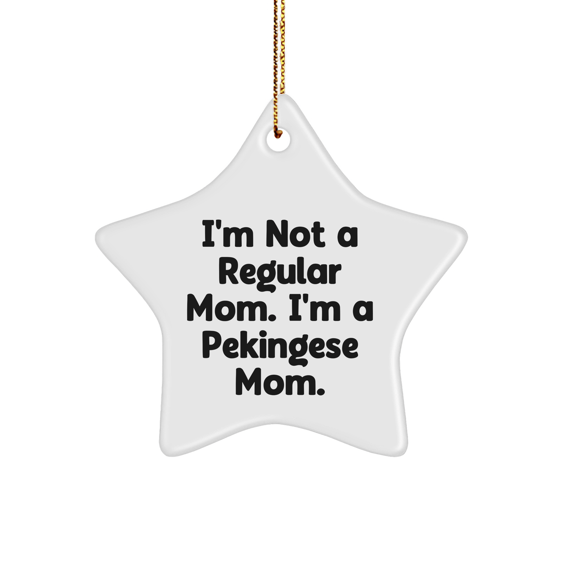 Are you a Pekingese dog lover looking for a unique Christmas gift? Look no further! This funny star ornament is perfect for any Pekingese dog mom or dad. The quote 'I'm Not A Regular Mom. I'm A Pekingese Mom.' is a humorous way to express your love for your furry friend. Made from sturdy MDF with a high-gloss plastic finish, this ornament is lightweight and resistant to breaking. It's a great choice for households with children or pets. The festive gold cord makes it easy to hang in any room. Whether you're buying for a friend, family member, or coworker, this Pekingese dog star ornament is a thoughtful and unique gift. So why settle for a boring gift when you can give a Pekingese dog mom a funny and personalized present? Don't miss out and get ready to make someone's Christmas a little brighter!
