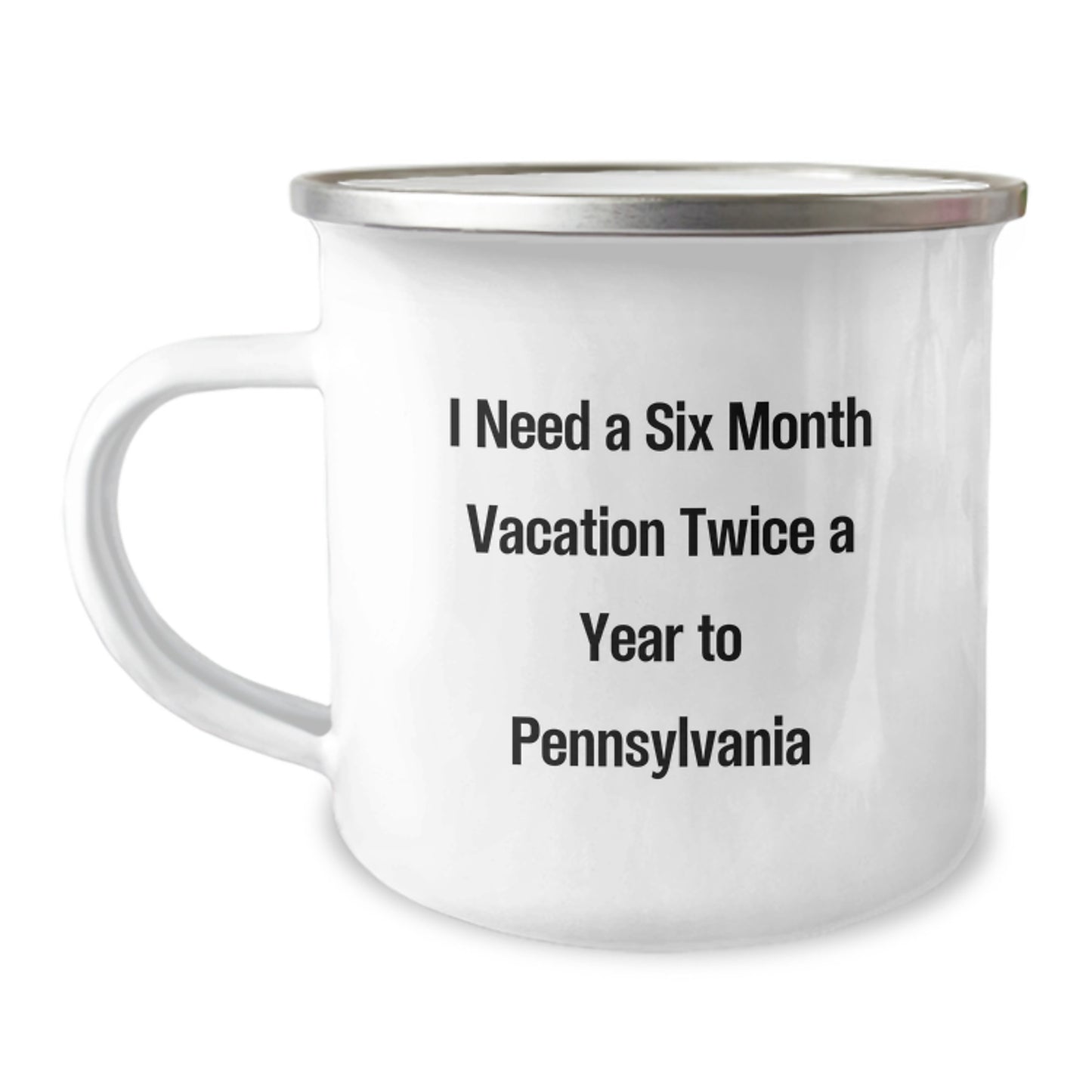 • This Pennsylvania Camping Mug is the ideal gift for anyone who loves the outdoors and the Keystone State. The funny quote 'I Need A Six Month Vacation Twice A Year To Pennsylvania' will surely bring a smile to their face, and the high-quality stainless steel construction ensures that it will last for a long time.