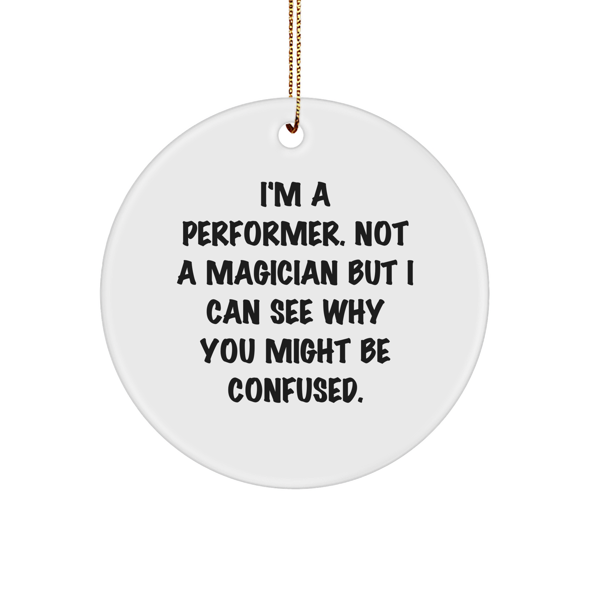 Are you a performer enthusiast or searching for a unique gift for the performer in your life? Look no further! This Christmas, gift them with a thoughtful and humorous Circle Ornament that showcases their talents. The funny quote 'I'm A Performer. Not A Magician But I Can See Why You Might Be Confused.' adds a playful touch to this already amazing gift. Made from sturdy MDF with a high-gloss plastic finish, this Circle Ornament is lightweight, resistant to breaking, and features bright, vivid colors. Perfect for stress-free decorating, it ships with a festive gold cord. Whether you're a friend, coworker, or family member, this gift is sure to bring a smile to their face. So why wait? Don't miss out and make this Christmas one to remember!