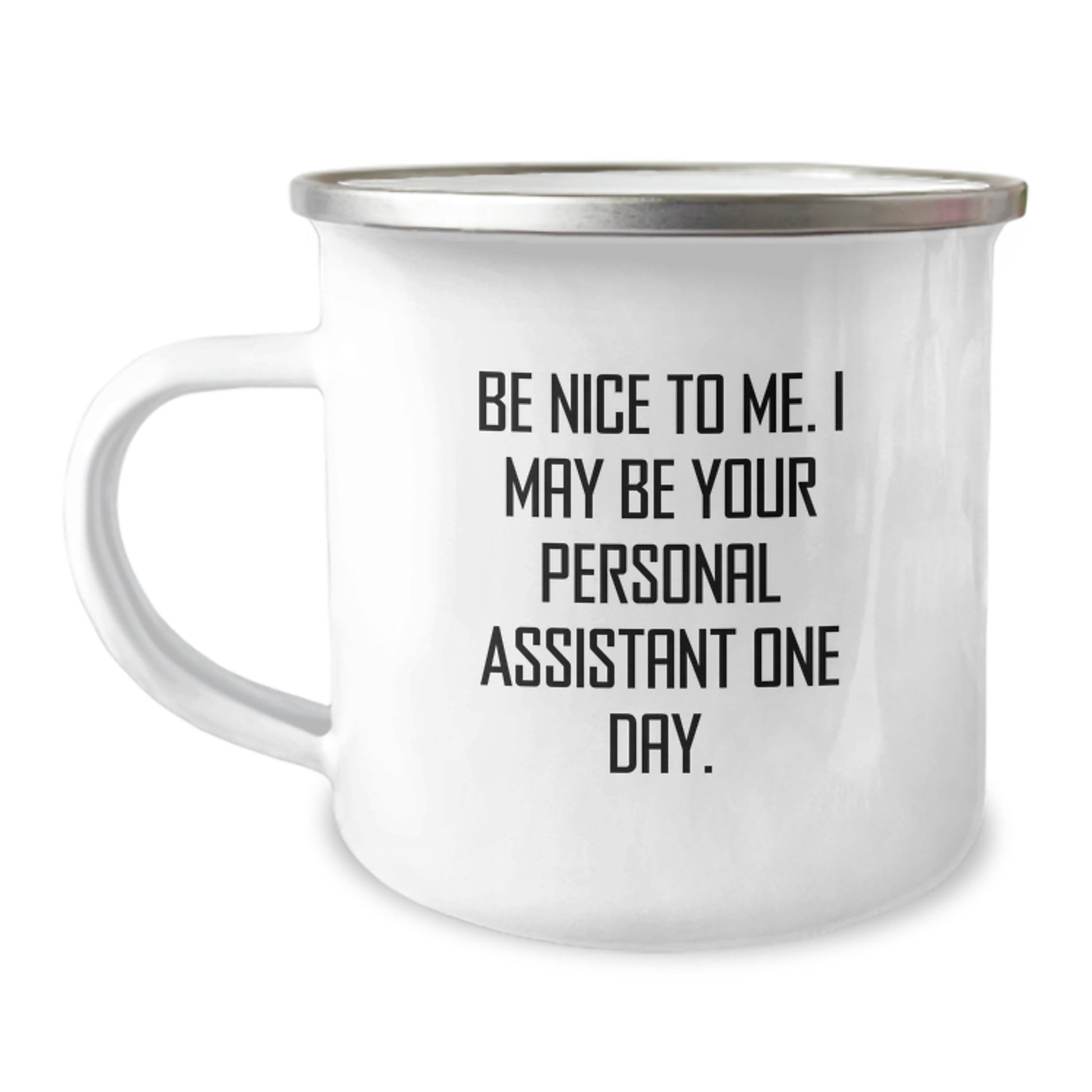 Are you looking for a unique gift for your personal assistant? Look no further! This camping mug is perfect for the personal assistant in your life who deserves a little recognition. The quote 'Be Nice To Me. I May Be Your Personal Assistant One Day.' is a humorous reminder of the importance of kindness in the workplace. As a gift from friends, this mug is sure to bring a smile to their face.