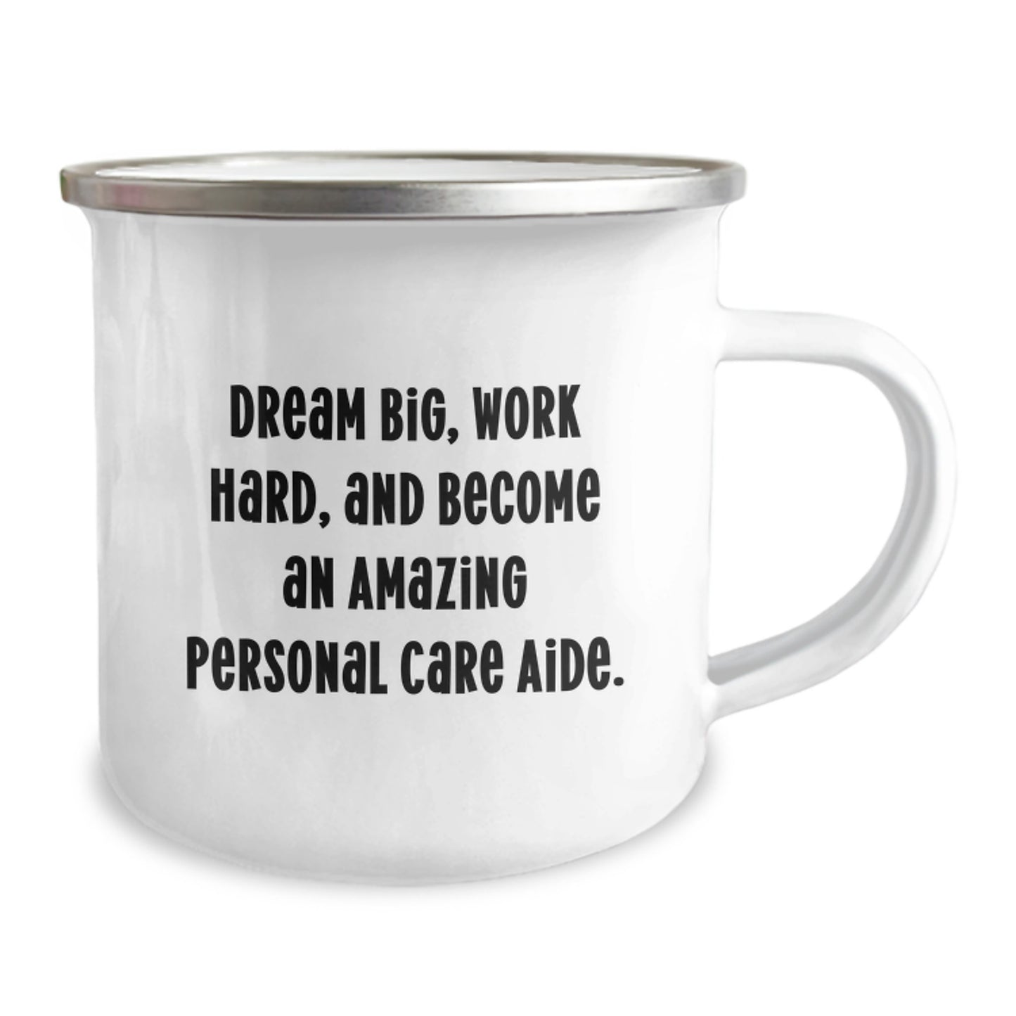 - Make a statement with this 'Dream Big, Work Hard, And Become An Amazing Personal Care Aide.' inspired camping mug, perfect for the dedicated Personal Care Aide who loves the great outdoors and wants to stay warm and cozy while enjoying their favorite hot beverages on the go, with a 12 oz capacity that's just right for a daily dose of caffeine or tea. This stainless steel mug with enamel finish is durable and easy to clean, and the permanent printing won't fade after washing.