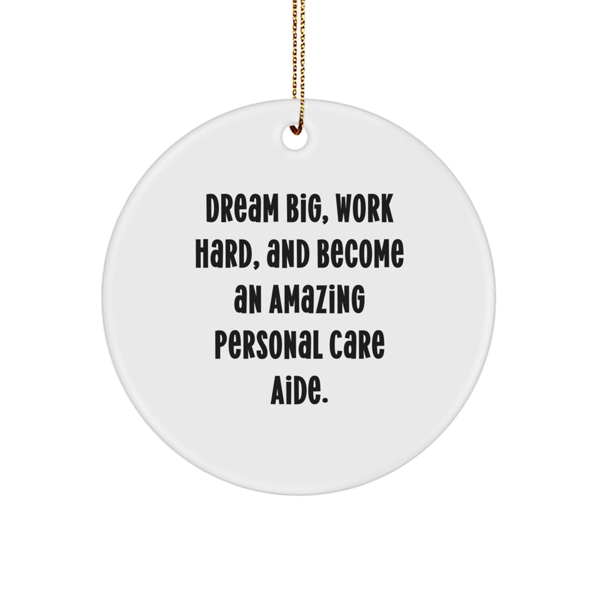- Make a memorable gift for the Personal Care Aide in your life with our 'Dream Big, Work Hard, And Become An Amazing Personal Care Aide.' quote circle ornament, crafted from durable MDF with a high-gloss plastic finish for long-lasting designs.