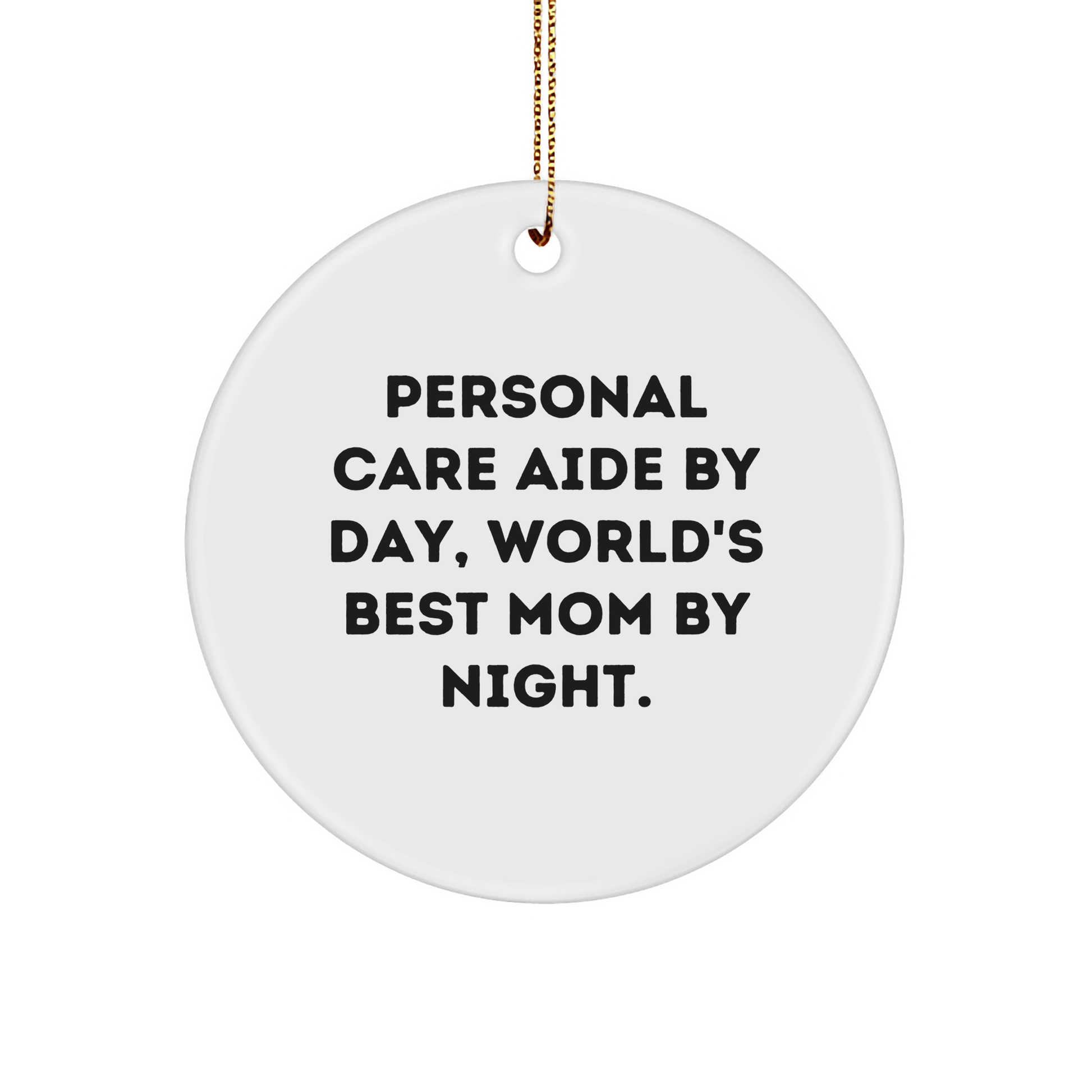 Celebrate the personal care aide in your life with this unique and humorous Christmas gift! As a personal care aide by day, she's a world's best mom by night. This circular ornament is the perfect way to show your appreciation for her hard work and dedication. Made from sturdy MDF with a high-gloss plastic finish, this ornament is lightweight and resistant to breaking, making it a great choice for households with children or pets. The vibrant printing ensures bright, vivid colors that will add a pop of color to any room.