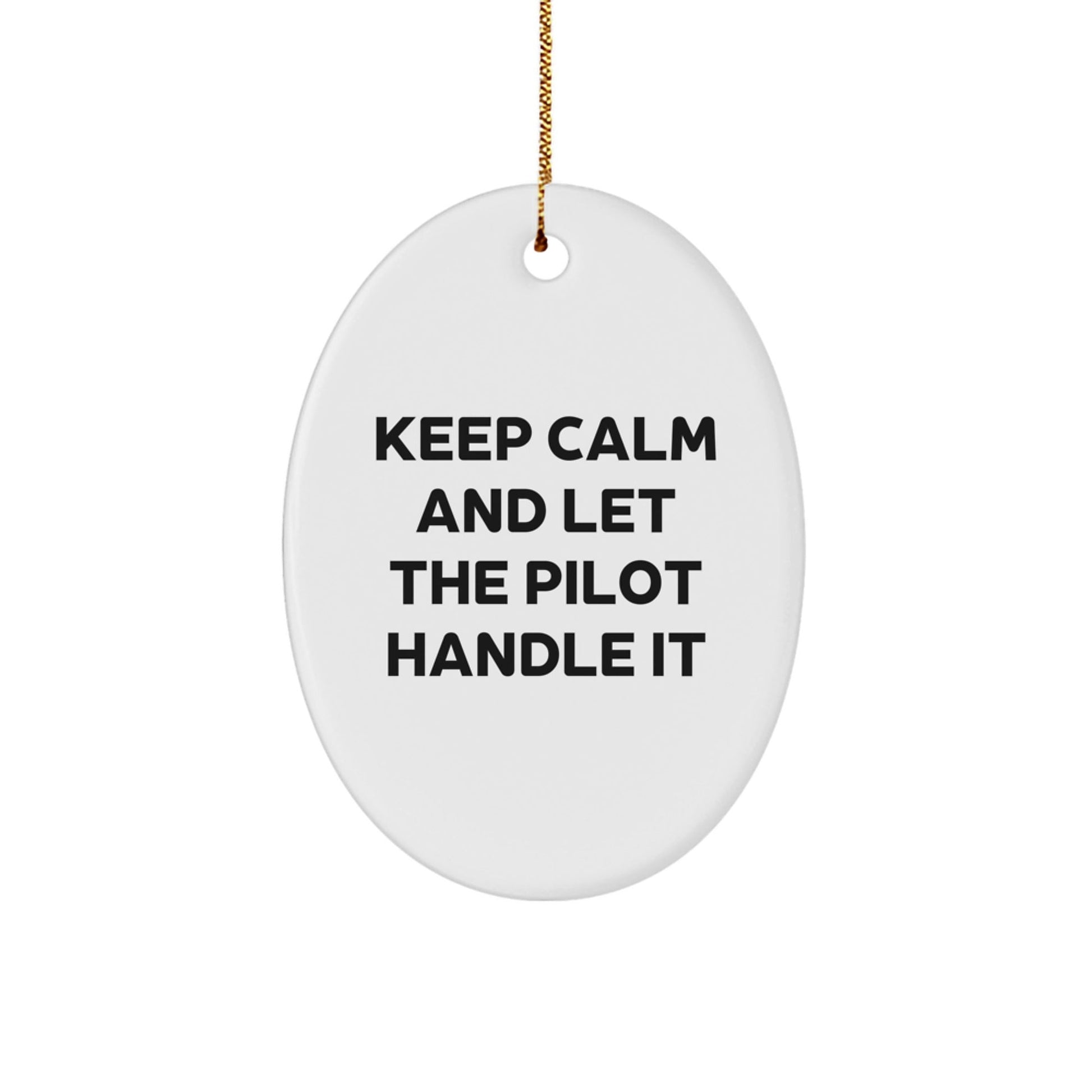Are you a pilot enthusiast or looking for a gift for your favorite pilot? Look no further! This Keep Calm Oval Ornament is the perfect way to show your love and appreciation for pilots. Made from sturdy MDF with a high-gloss plastic finish, this ornament is vibrantly printed from edge-to-edge with the quote 'Keep Calm and Let the Pilot Handle It'. It's the perfect addition to any pilot-themed decor.
