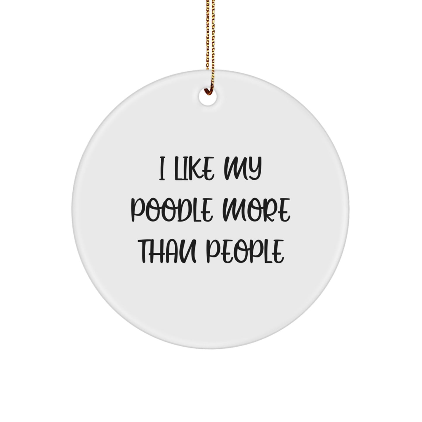 This Circle Ornament is a thoughtful and humorous way to celebrate the special bond between a Poodle Dog and its owner. It's a great conversation starter and will be a treasured keepsake for years to come. So why not give the gift of laughter and joy this holiday season? Get your 'I Like My Poodle More Than People' Circle Ornament today and make it a Christmas to remember!