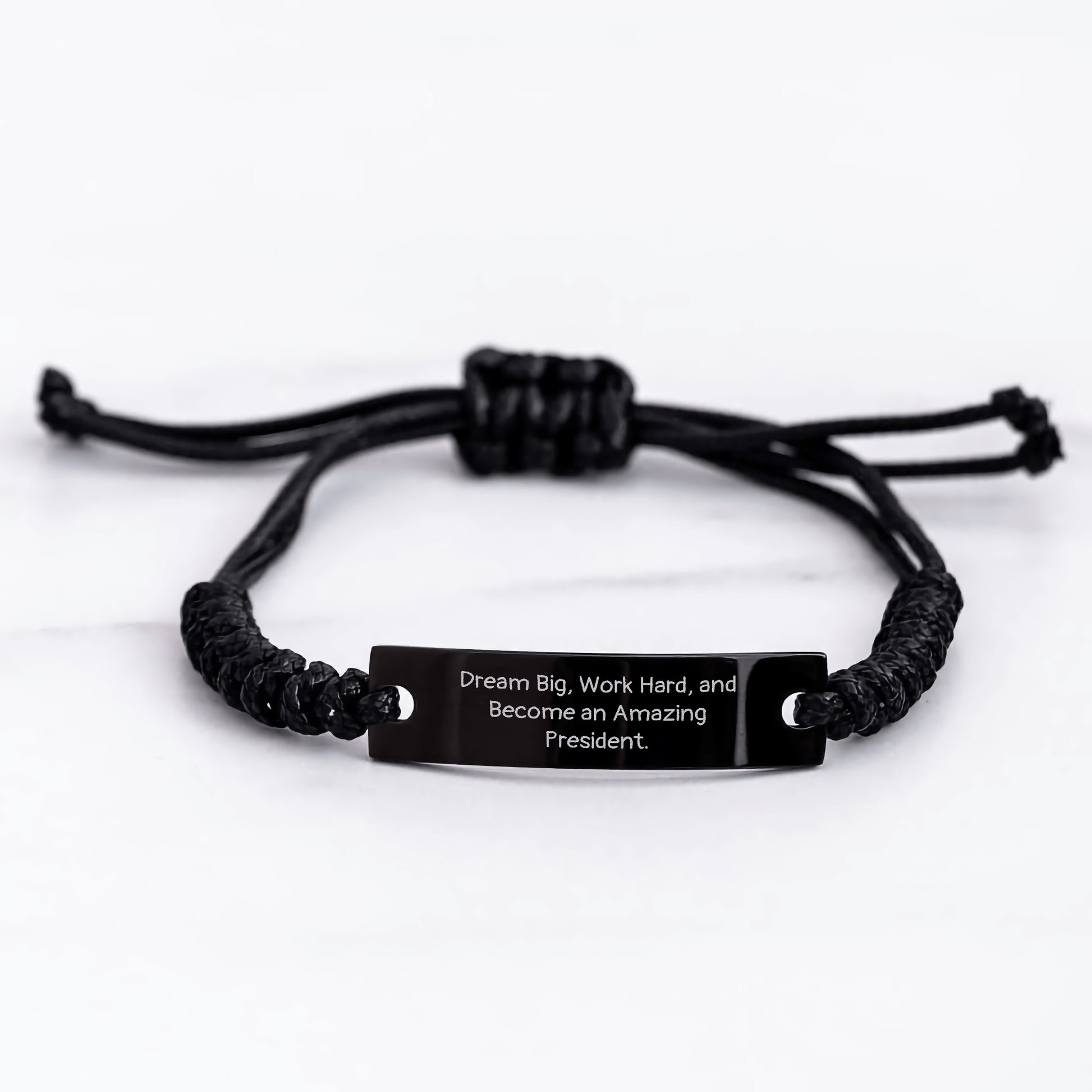 Are you looking for a unique gift for the President in your life? Look no further! This amazing Rope Bracelet is the perfect way to show your appreciation for their hard work and dedication. Engraved with the inspiring quote 'Dream Big, Work Hard, And Become An Amazing President.', this bracelet is a thoughtful gift for any occasion, especially graduation. The black stainless steel with interlaced rope design is both stylish and sturdy, making it a great accessory for anyone. Whether you're giving it to a President, a friend, or a family member, this gift is sure to be cherished. So why wait? Get this incredible President Rope Bracelet today and make a lasting impression!