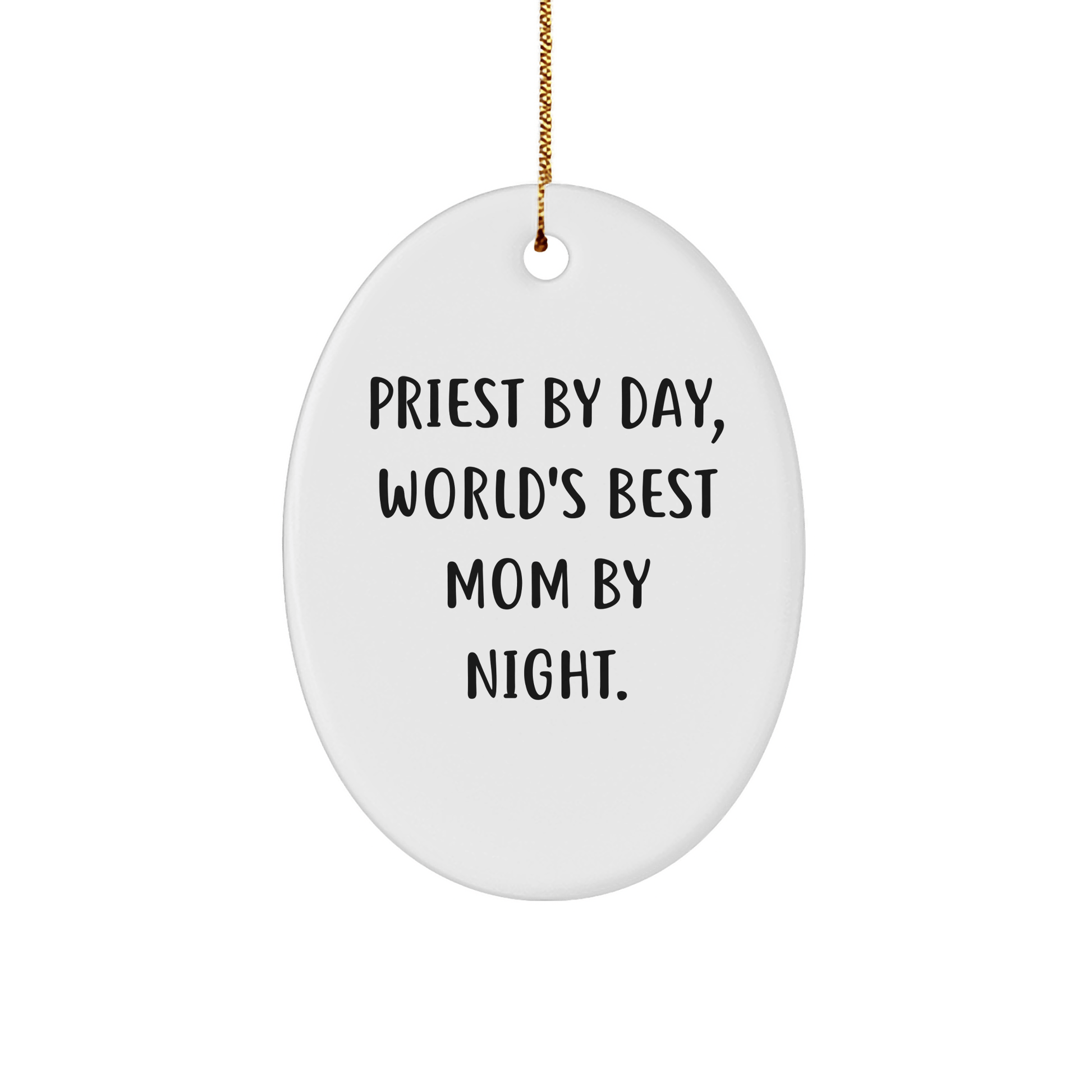 - Add a touch of faith to your holiday decor with our 'Priest By Day, World's Best Mom By Night.' oval ornament. Its lightweight and resistant design makes it perfect for households with children or pets, and the festive gold cord ensures easy hanging.