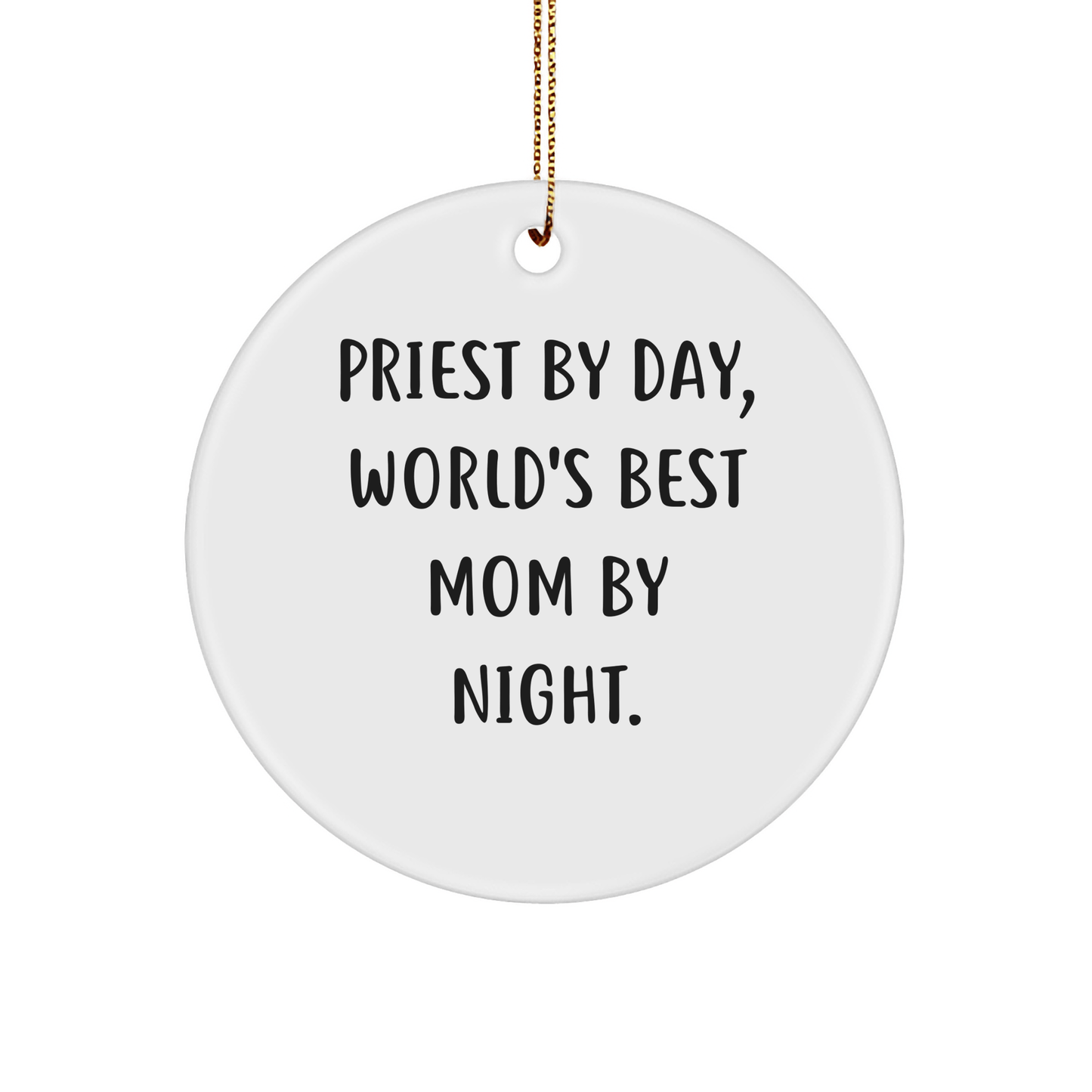 - This funny circle ornament is a unique and thoughtful gift for the Priest in your life, showcasing their 'Priest By Day, World's Best Mom By Night.' quote.