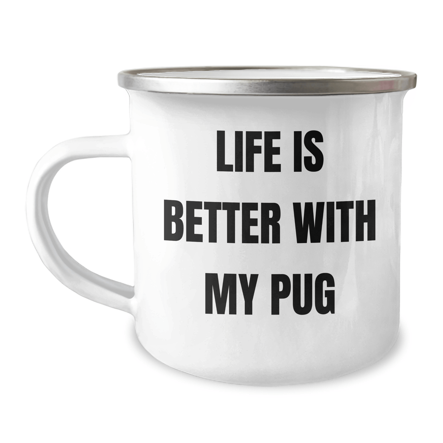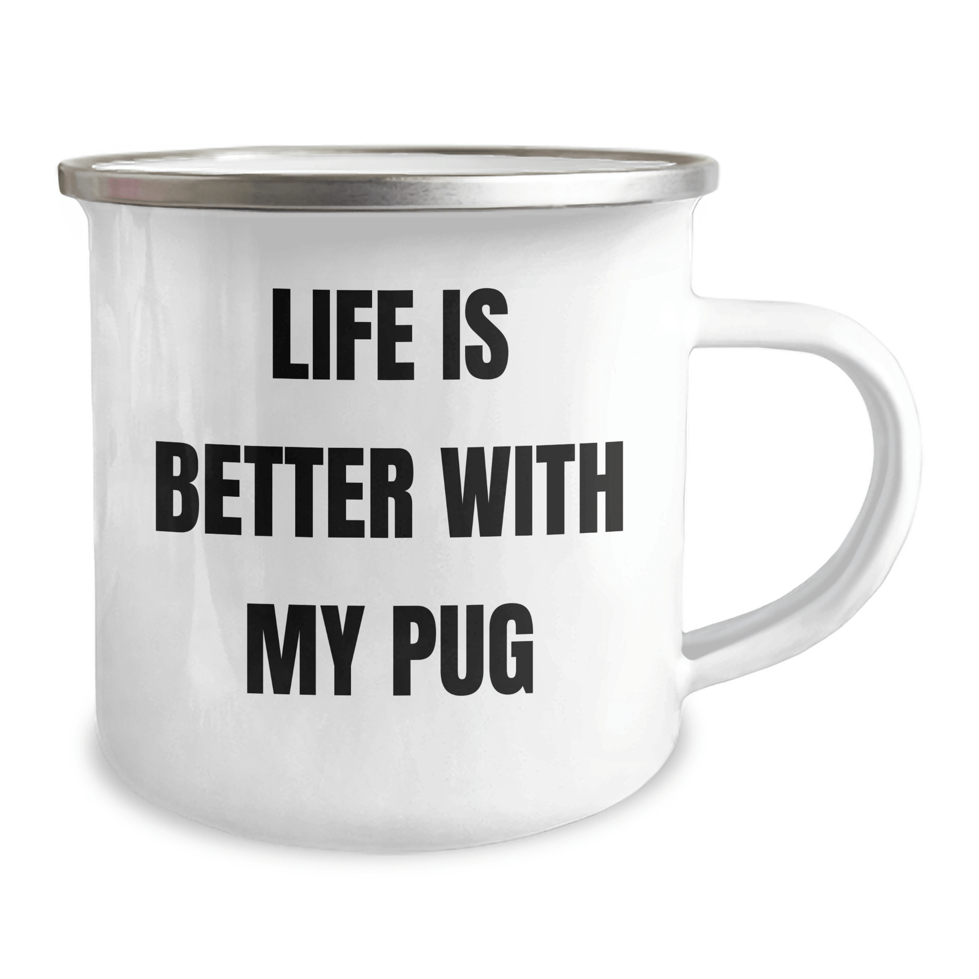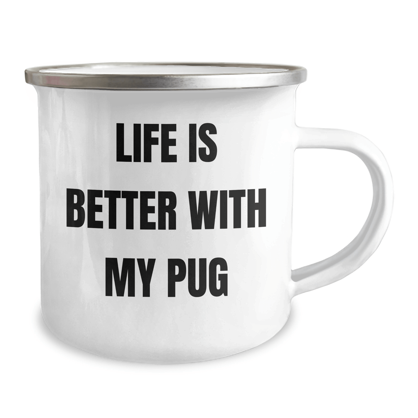 - Make your outdoor adventures even more enjoyable with this Pug Dog Camping Mug, perfect for Father's Day gifts, featuring a fun quote 'Life Is Better With My Pug' that will bring a smile to every pug lover's face, and the 12 oz stainless steel with enamel finish ensures a comfortable and refreshing beverage experience.