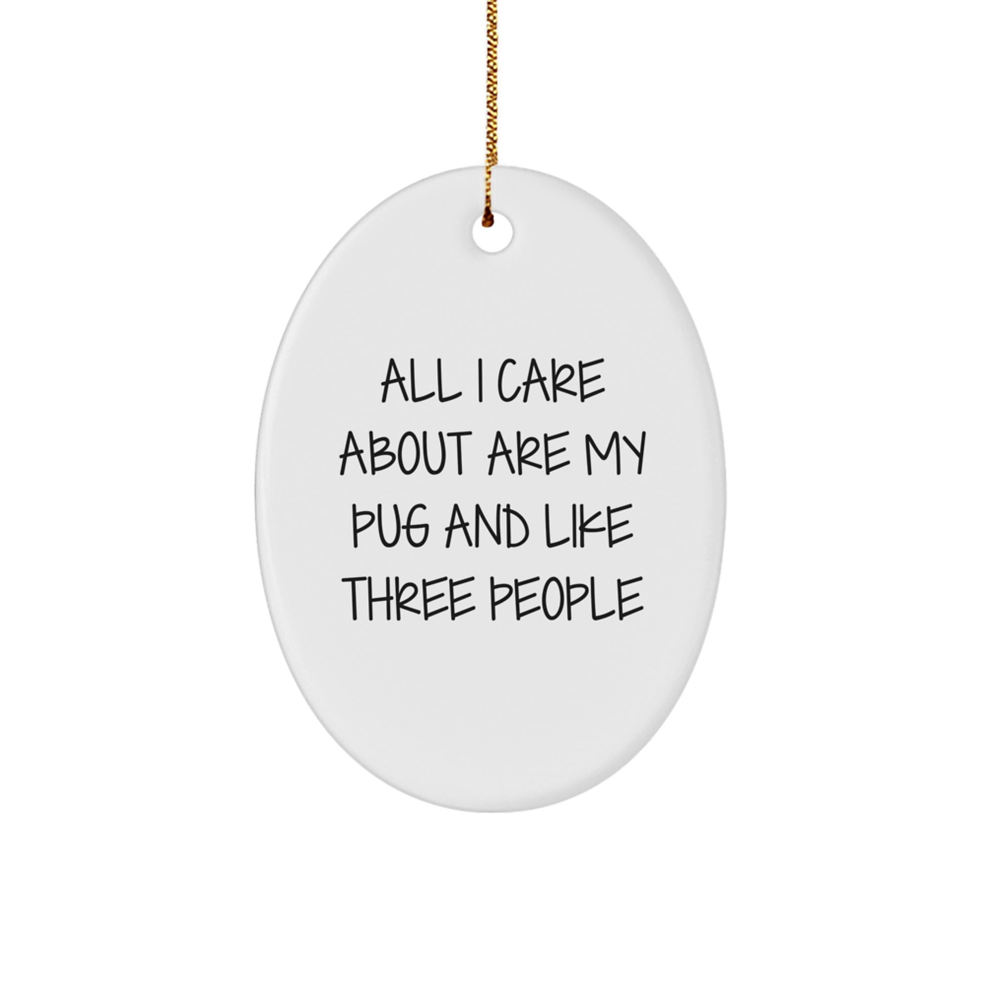 Are you a Pug Dog enthusiast or searching for a unique gift for a Pug Dog lover? Look no further! This 'All I Care About Are My Pug And Like Three People' Oval Ornament is the perfect addition to your home or office. Crafted from sturdy MDF with a high-gloss plastic finish, this ornament is vibrantly printed from edge-to-edge via Sublimation, ensuring bright, vivid colors. With its lightweight and resistant design, it's a great choice for households with children or pets. Ships with a festive gold cord for easy hanging, perfect for stress-free decorating. Whether you're a Pug Dog mom or dad, or just a fan of these adorable dogs, this ornament is sure to bring a smile to your face. So why wait? Get your Pug Dog Oval Ornament today and make it a Christmas to remember!