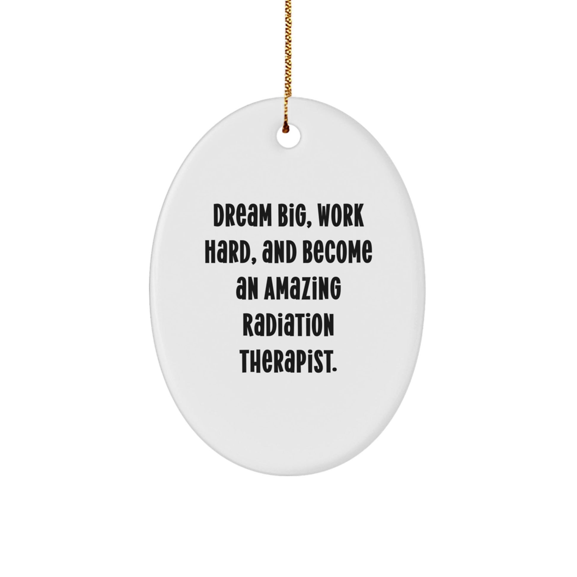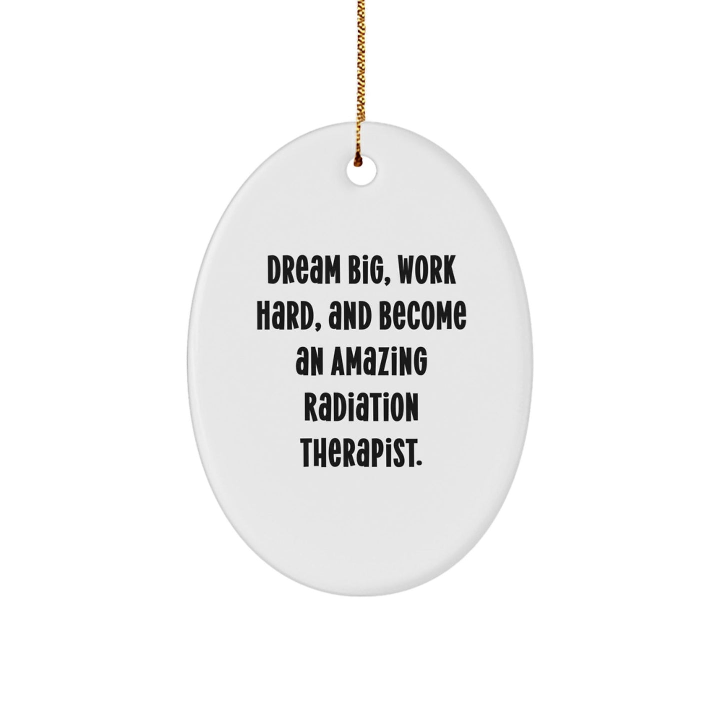 - This Radiation Therapist Oval Ornament is a thoughtful gift for friends, family, or coworkers who have made a difference in your life. With its vibrant colors and inspirational quote, 'Dream Big, Work Hard, And Become An Amazing Radiation Therapist.', this ornament is sure to be a treasured keepsake for years to come.