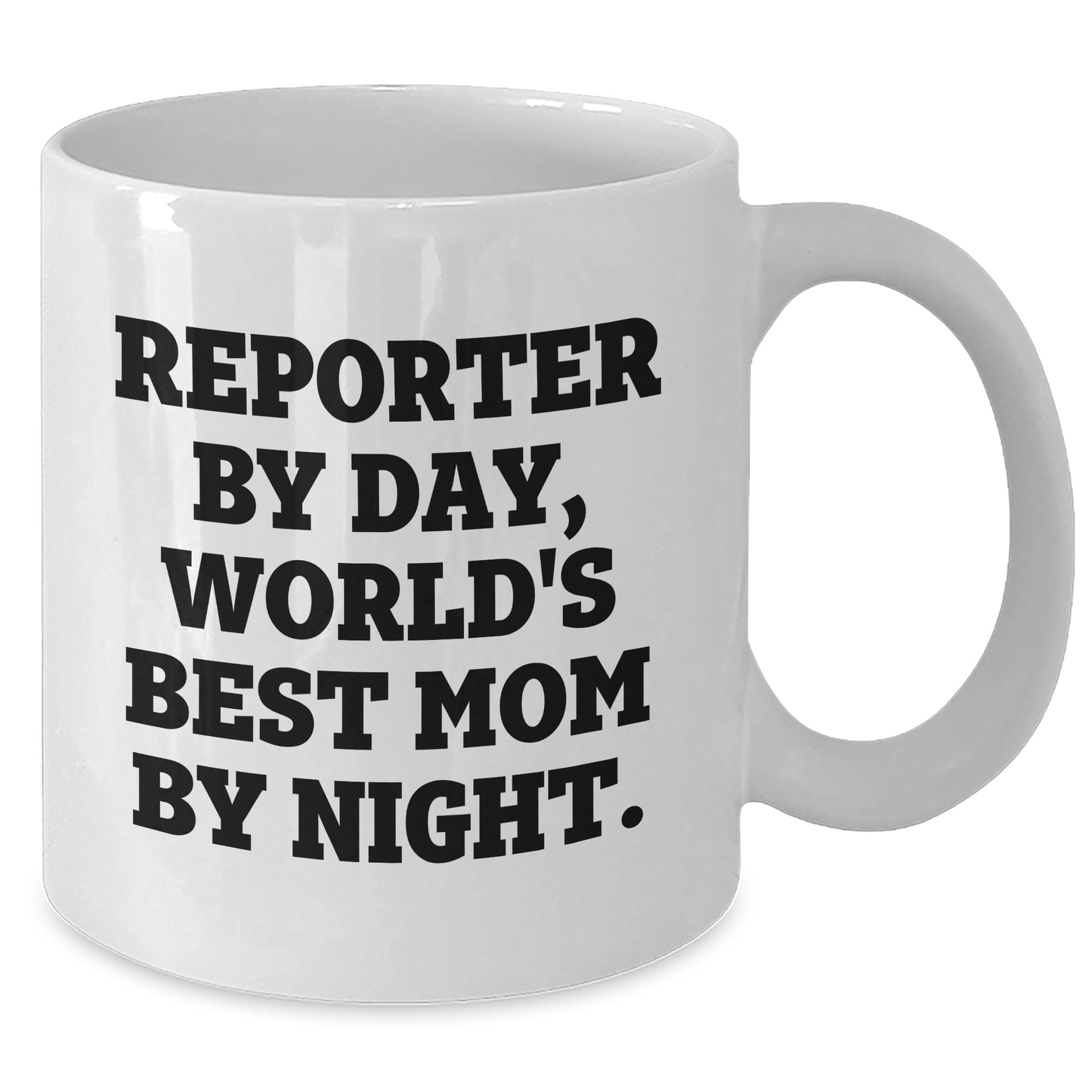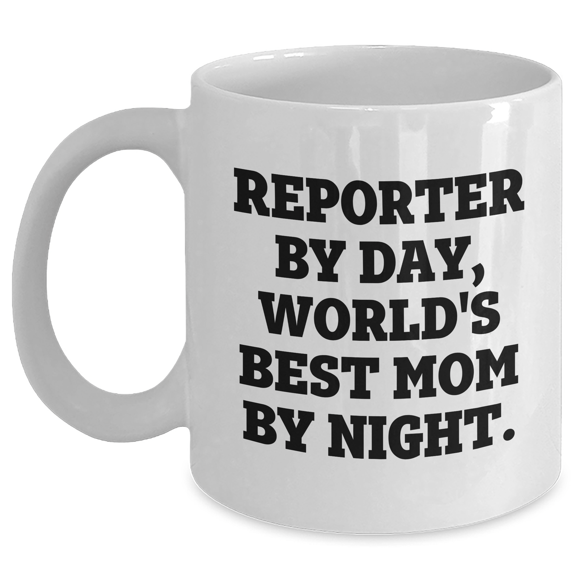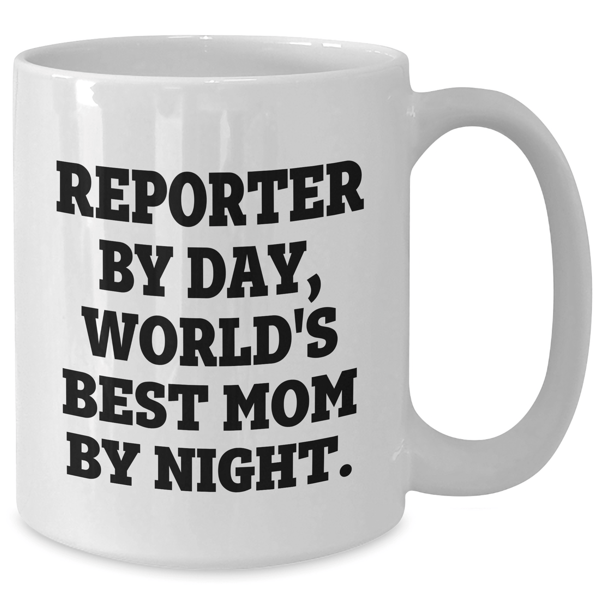 Are you looking for a thoughtful gift for the reporter in your life? Look no further! This funny white coffee mug is perfect for any reporter, whether it's a friend, family member, or coworker. The quote 'Reporter By Day, World's Best Mom By Night' is a humorous take on the dual identity of a reporter and a mom.