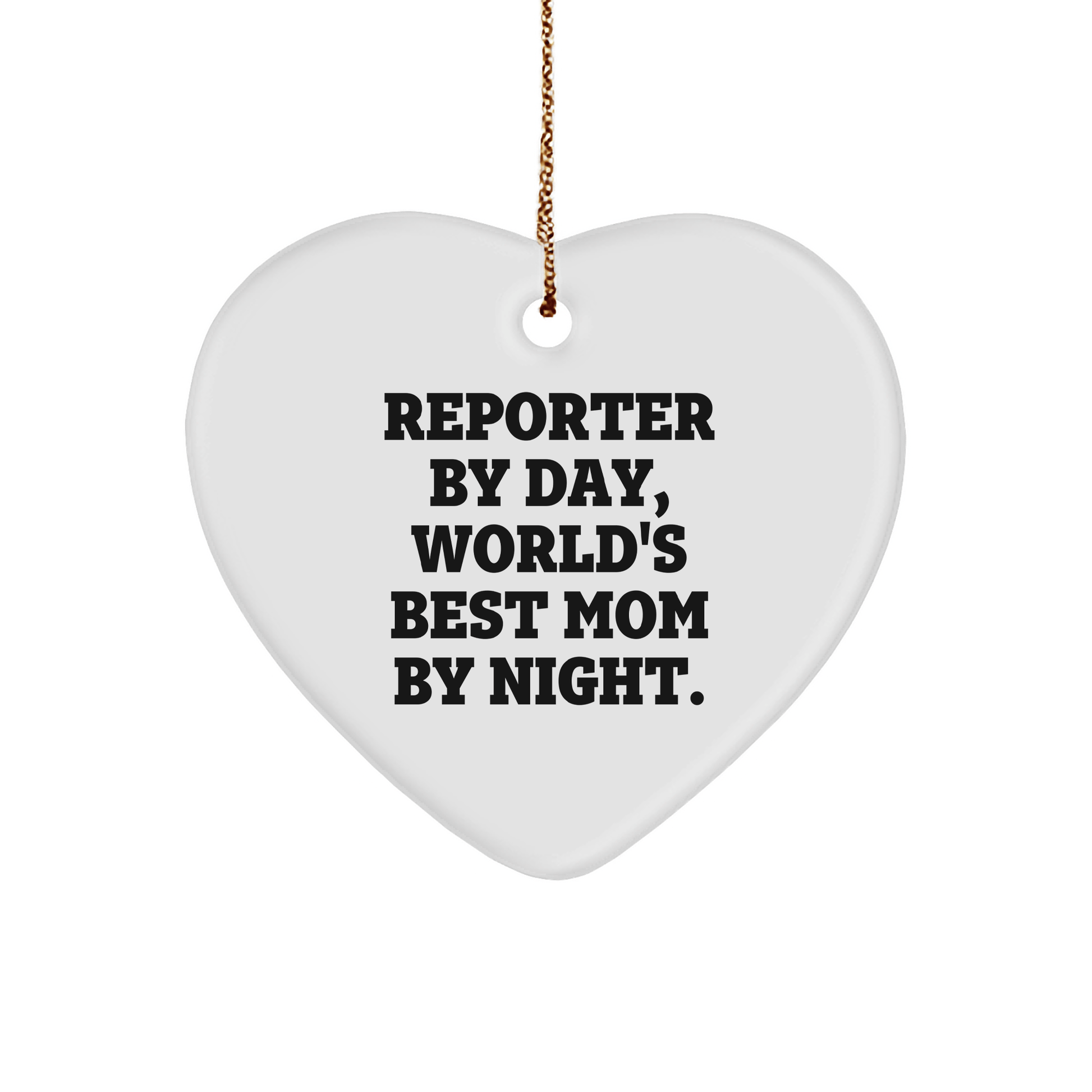 - This heart-shaped ornament features the funny and relatable quote 'Reporter By Day, World's Best Mom By Night.' It's the ideal gift for reporters and moms alike.