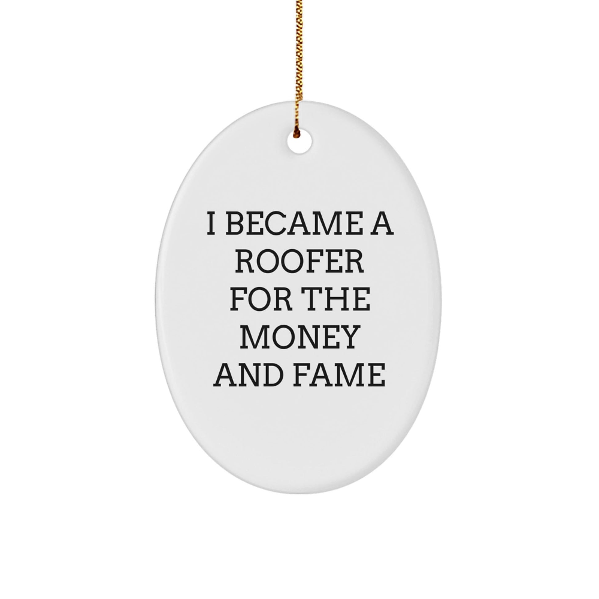 - This Oval Ornament is a fun and quirky way to show your appreciation for the roofer in your life, featuring the humorous quote 'I Became A Roofer For The Money And Fame'. Made from sturdy MDF with a high-gloss plastic finish, it's lightweight and resistant to breaking, making it a great choice for households with children or pets.