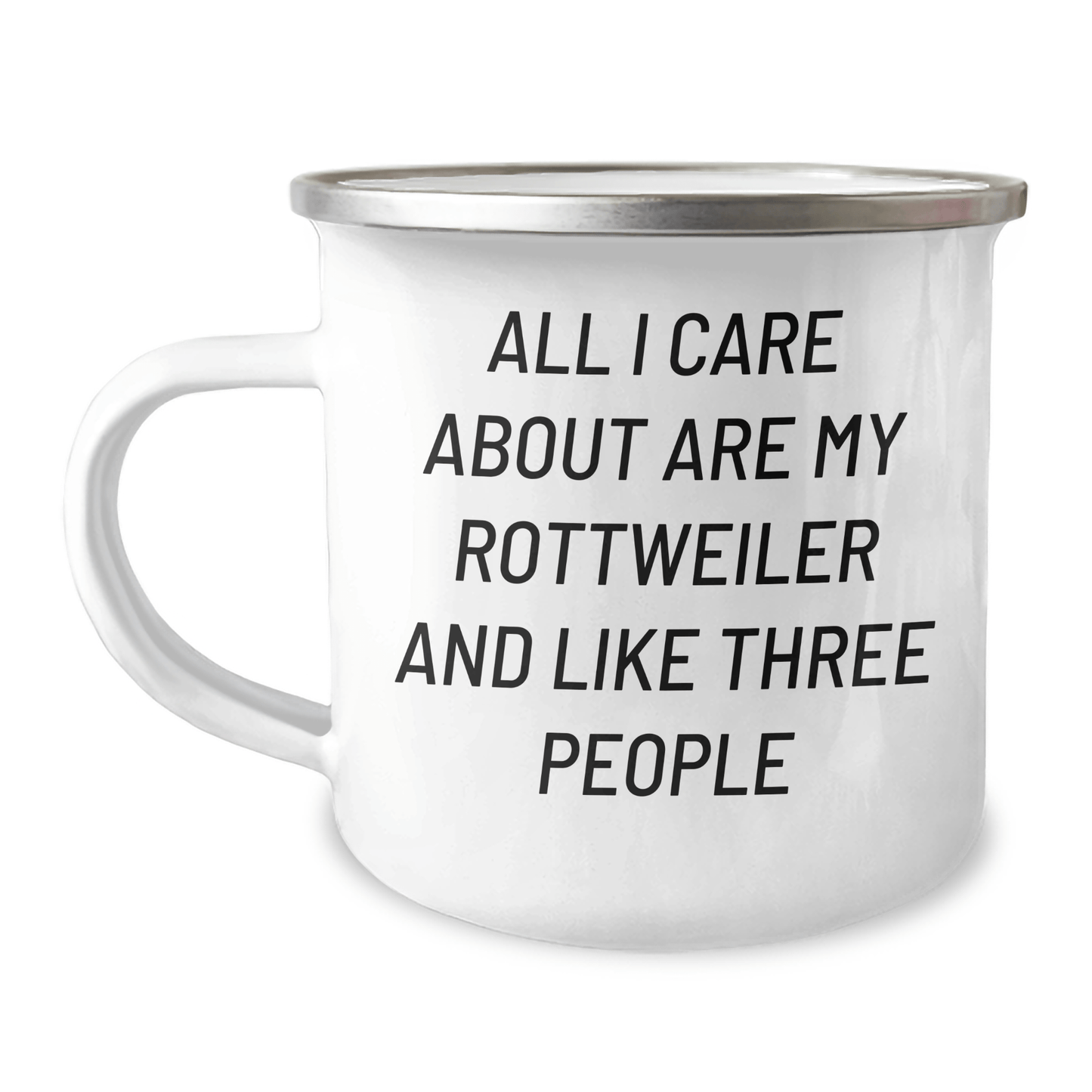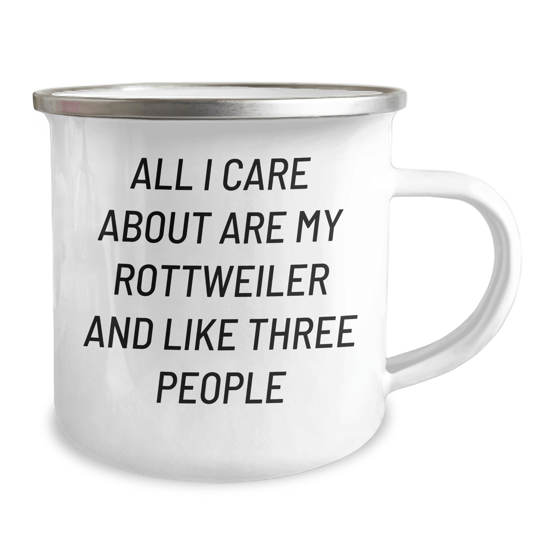 - Indulge in the rugged charm of your 'All I Care About Are My Rottweiler And Like Three People' pride as you sip your morning coffee from this Rottweiler-themed camping mug. Perfect for camping trips or daily use, this stainless steel mug with enamel finish is durable and easy to clean.