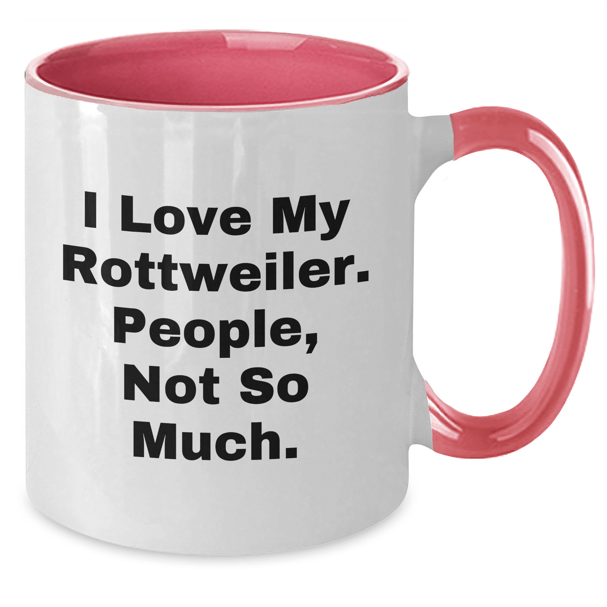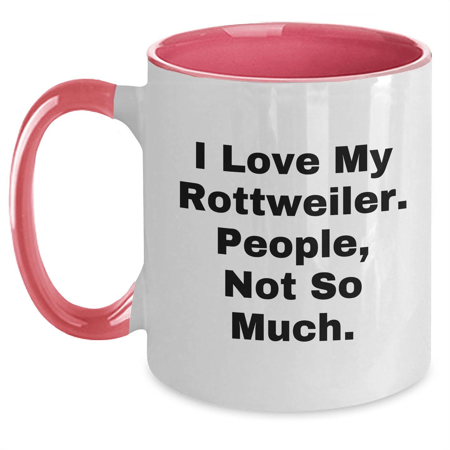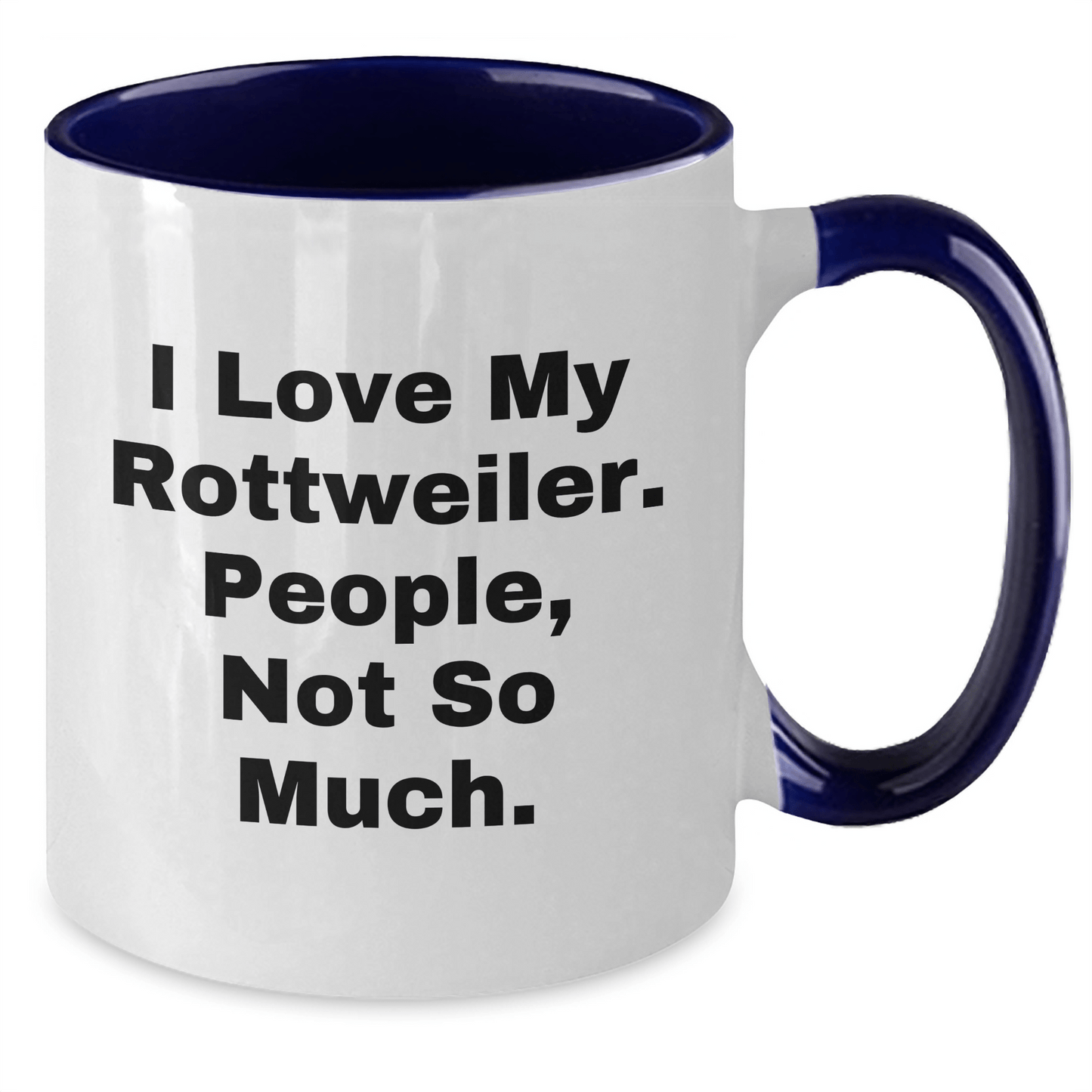 Are you a Rottweiler Dog enthusiast or looking for a unique gift for a Rottweiler Dog owner? This funny quote coffee mug is perfect for you! With its two-tone design and inspirational quote 'I Love My Rottweiler. People, Not So Much.', this mug is sure to bring a smile to any Rottweiler Dog lover's face. The quote is a humorous take on the popular saying, and the design is sure to stand out. Whether you're giving it as a Father's Day gift or just want to treat yourself, this mug is a great way to show off your love for Rottweiler Dogs.