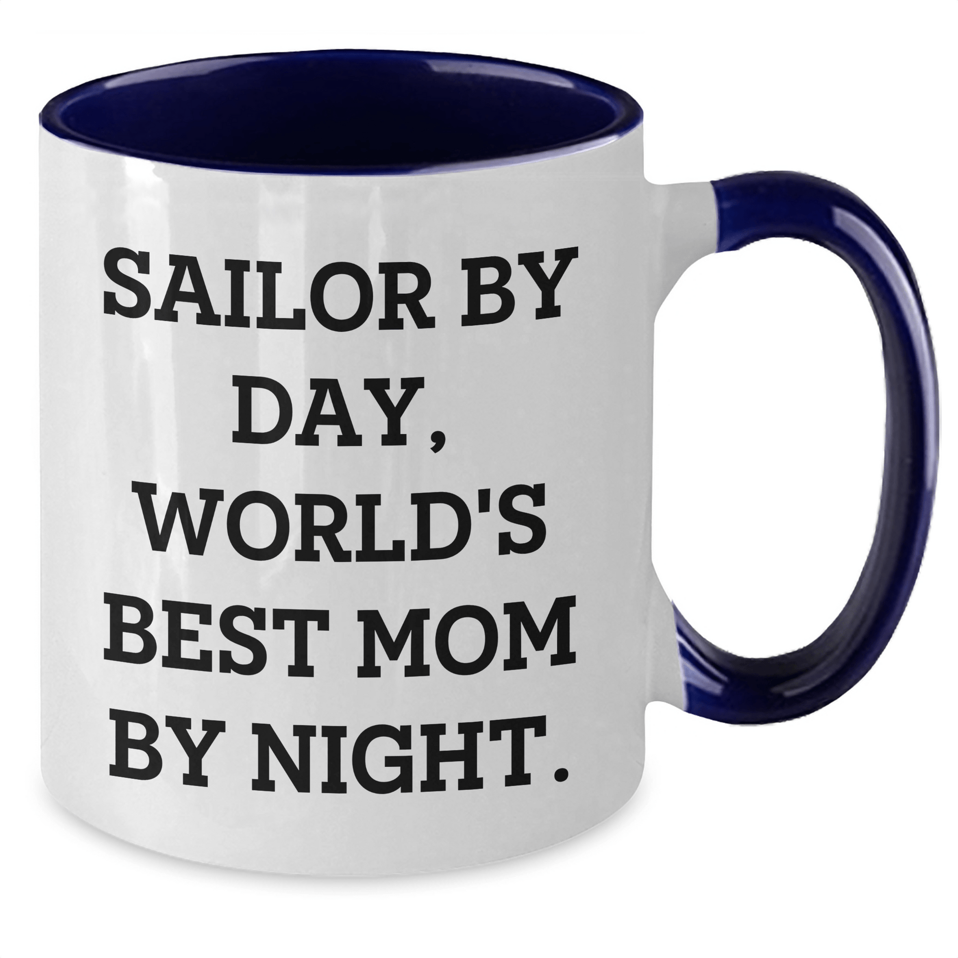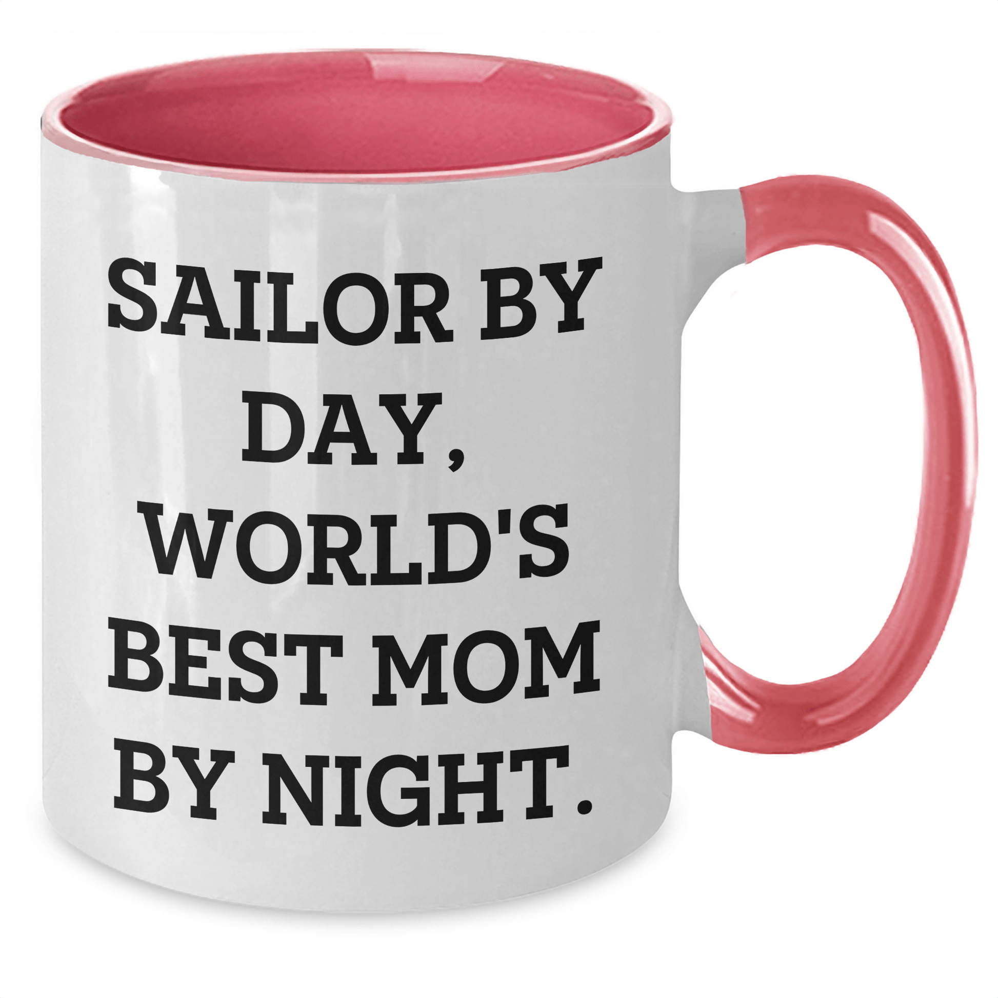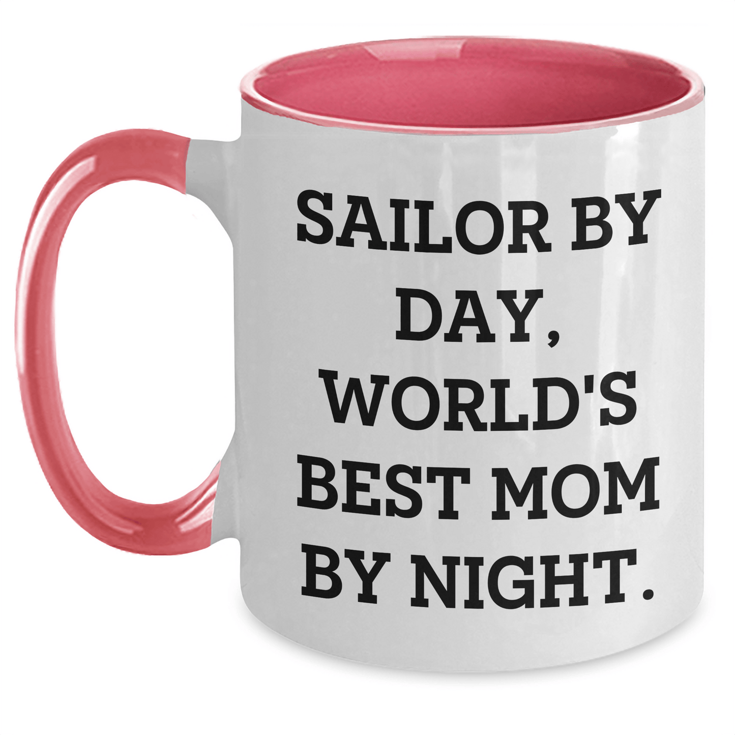 - The 'Sailor By Day, World's Best Mom By Night.' quote on this Two Tone Coffee Mug is a thoughtful gift idea for any sailor or boating enthusiast's mom, making it a unique and personalized present for the special woman in their life.
