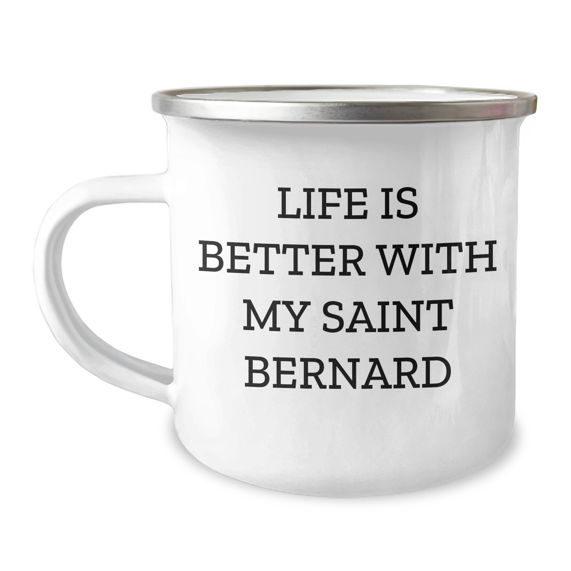- Bring the warmth and joy of your Saint Bernard dog to your outdoor adventures with this unique camping mug, featuring the inspiring quote 'Life Is Better With My Saint Bernard' to remind you of the importance of companionship and friendship. The 12 oz capacity stainless steel mug with enamel finish ensures your coffee or tea stays hot and fresh throughout your camping trip, and the permanent printing won't fade after washing.