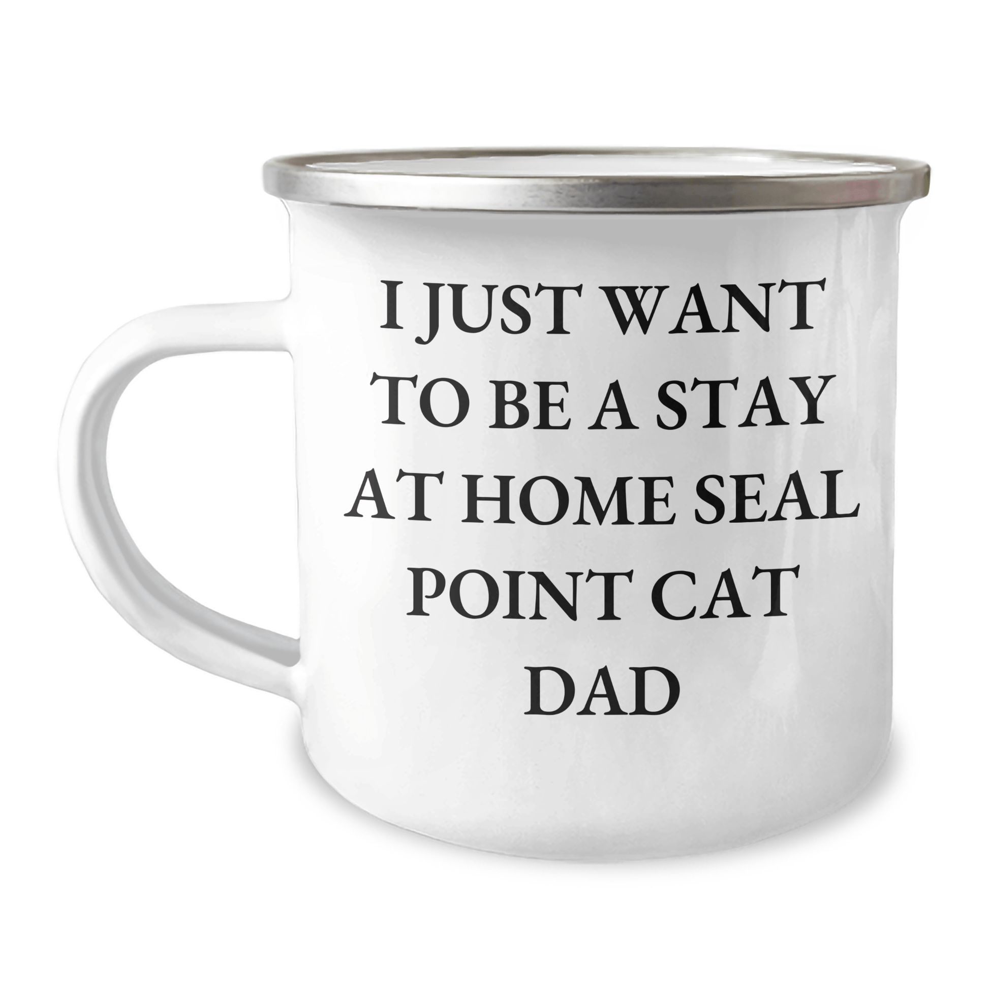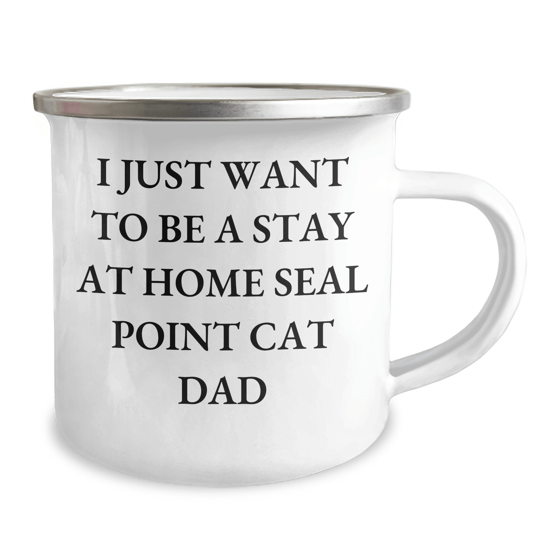 - As a loving 'I Just Want To Be A Stay At Home Seal Point Cat Dad', this camping mug is the purrfect gift for Father's Day. Made from stainless steel with an enamel finish, this 12 oz capacity mug is designed for everyday use. The permanent printing won't fade after washing, ensuring your favorite quote remains visible for years to come.