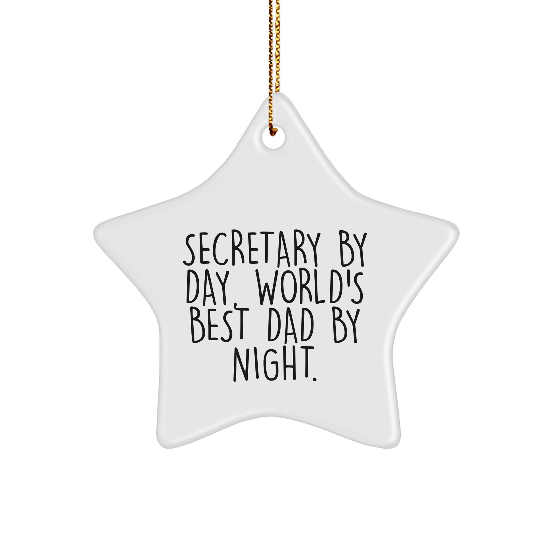 - Add a touch of humor to your holiday decor with this Secretary Star Ornament, featuring the funny quote 'Secretary By Day, World's Best Dad By Night.'